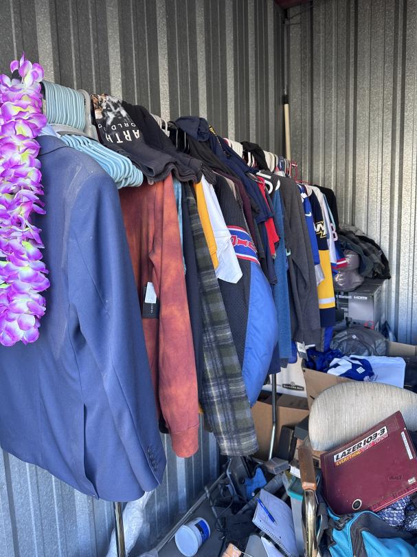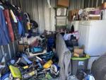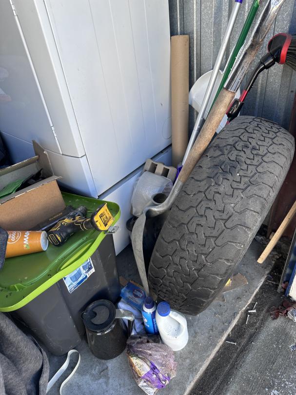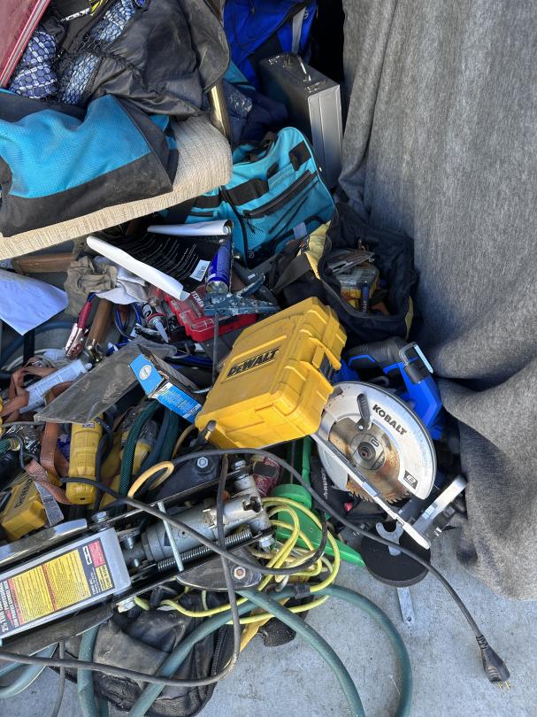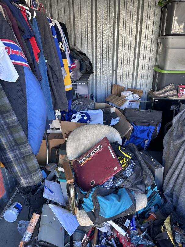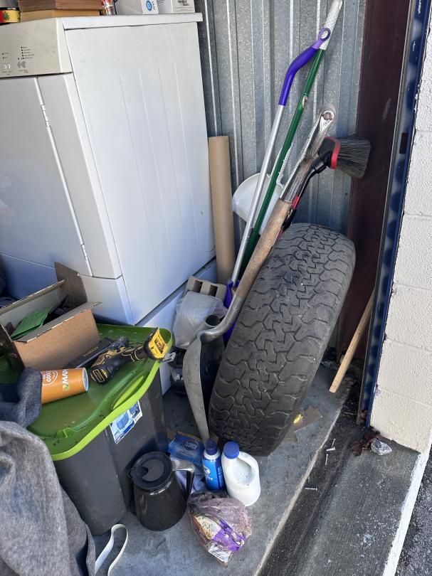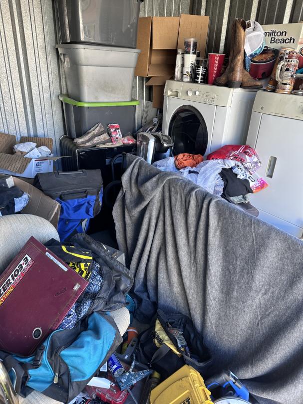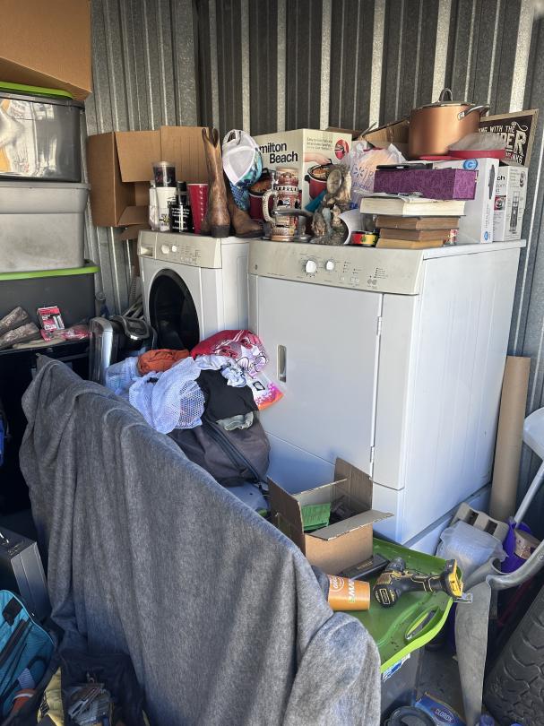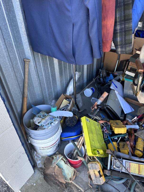 This unit appears to contain…Tool Box,Auto Parts,Tools,Power Tools,Washing Machine,Dryer,TV,Painting Supplies,Chairs,Kitchenware,Decor,Plastic Containers,Misc. Boxes,Clothing,Misc. Items,Suitcases