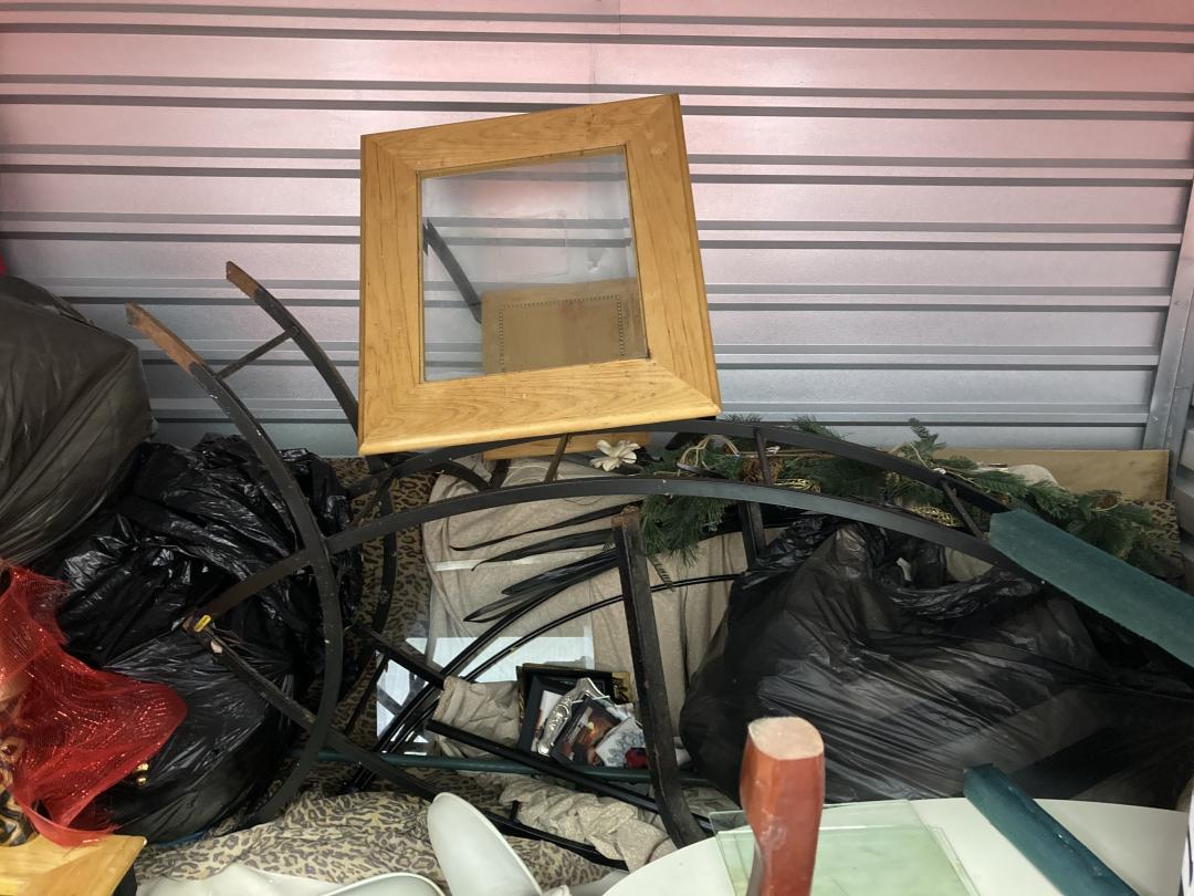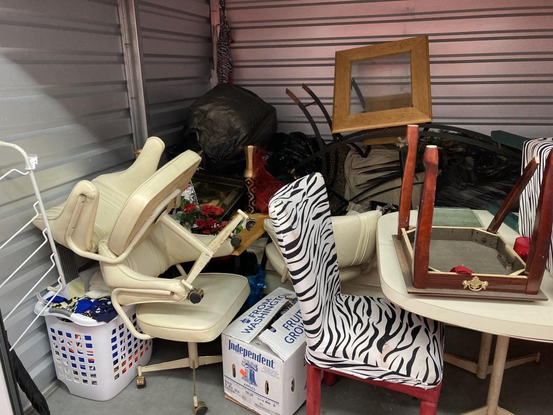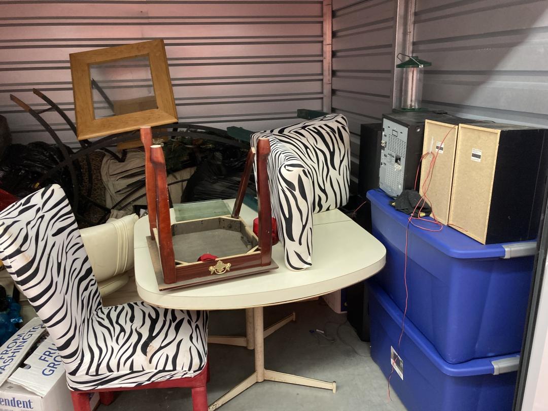 This unit appears to contain…Plastic totes, speakers, table, chairs, radio, basket, rolling chairs, bags, boxes, side table