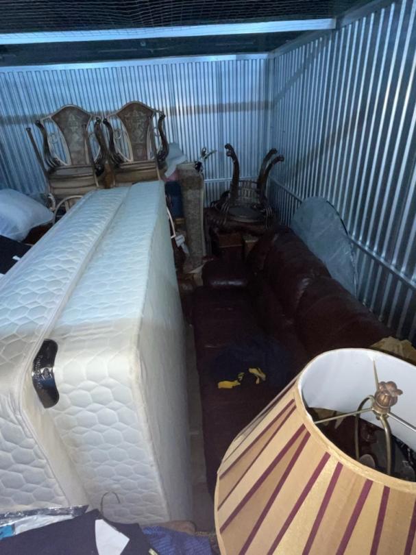 This unit appears to contain…clothes, totes, couch, mattress, bookshelve, lamps