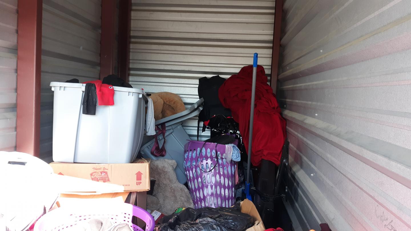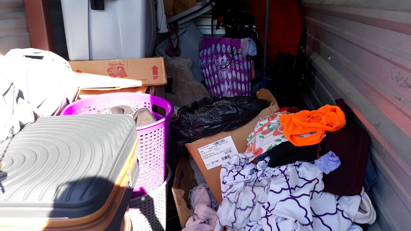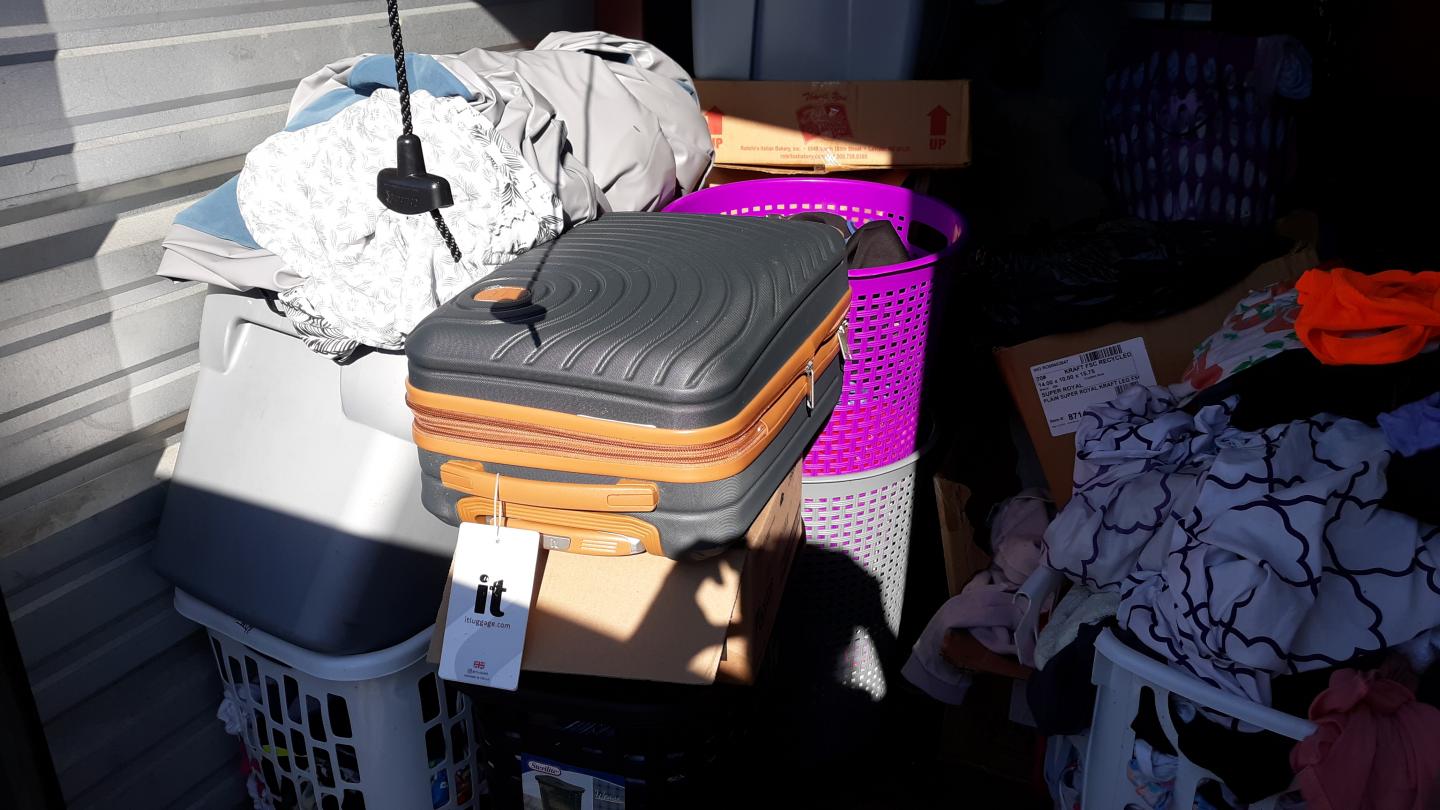 This unit appears to contain…TV Stand,Plastic Bags,Misc. Boxes,Clothing,Misc. Items,Suitcases,Laundry Baskets