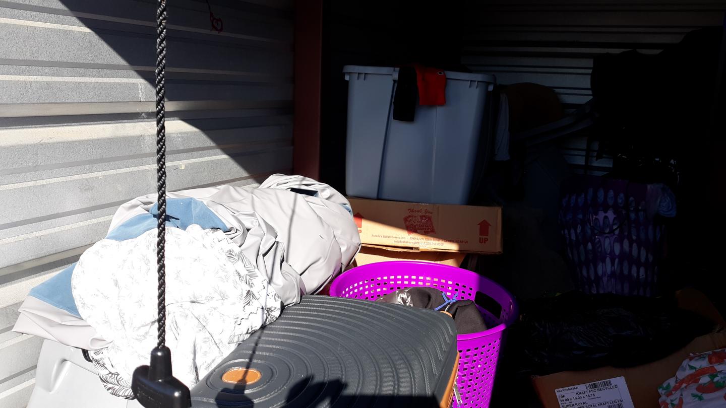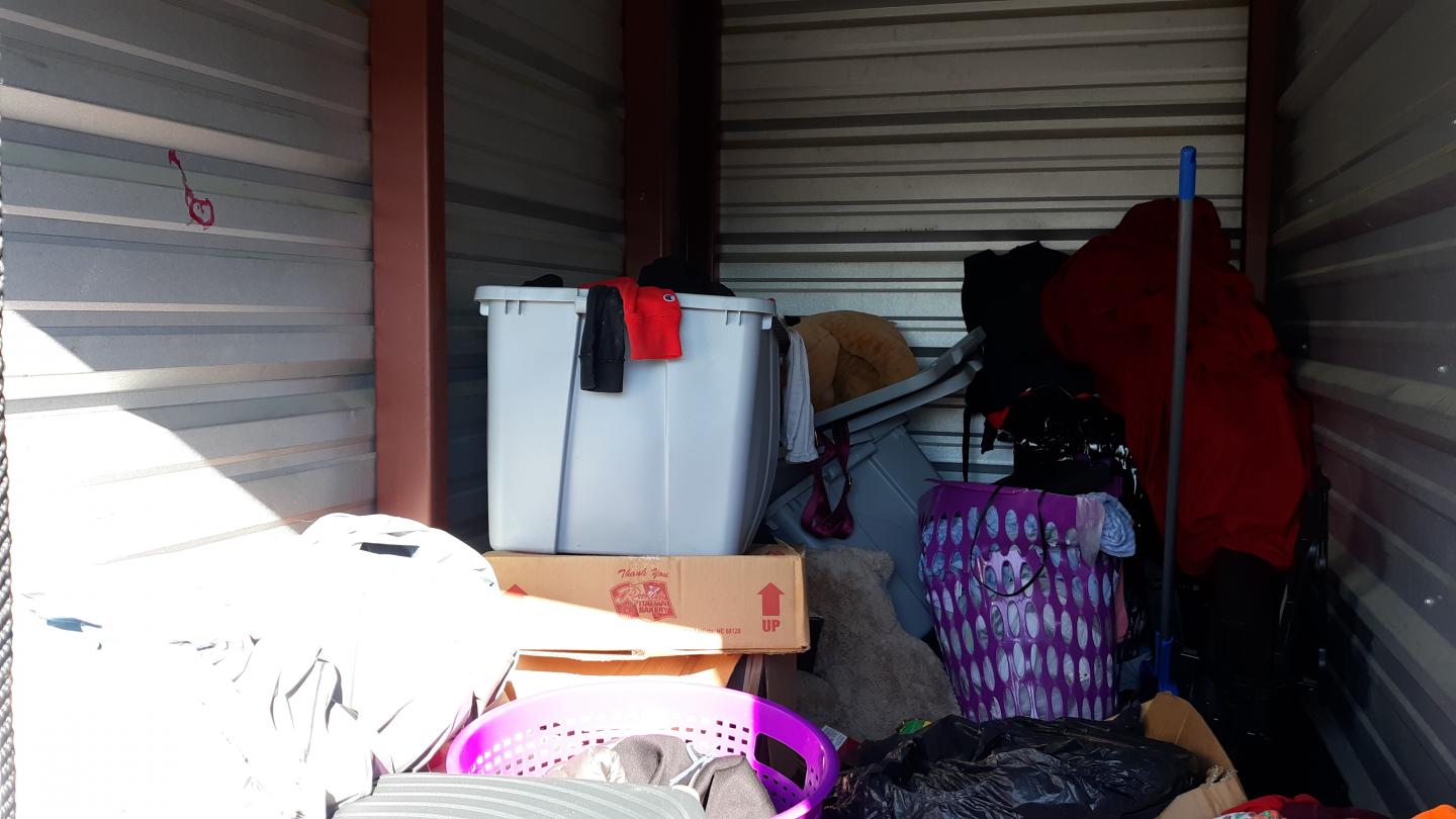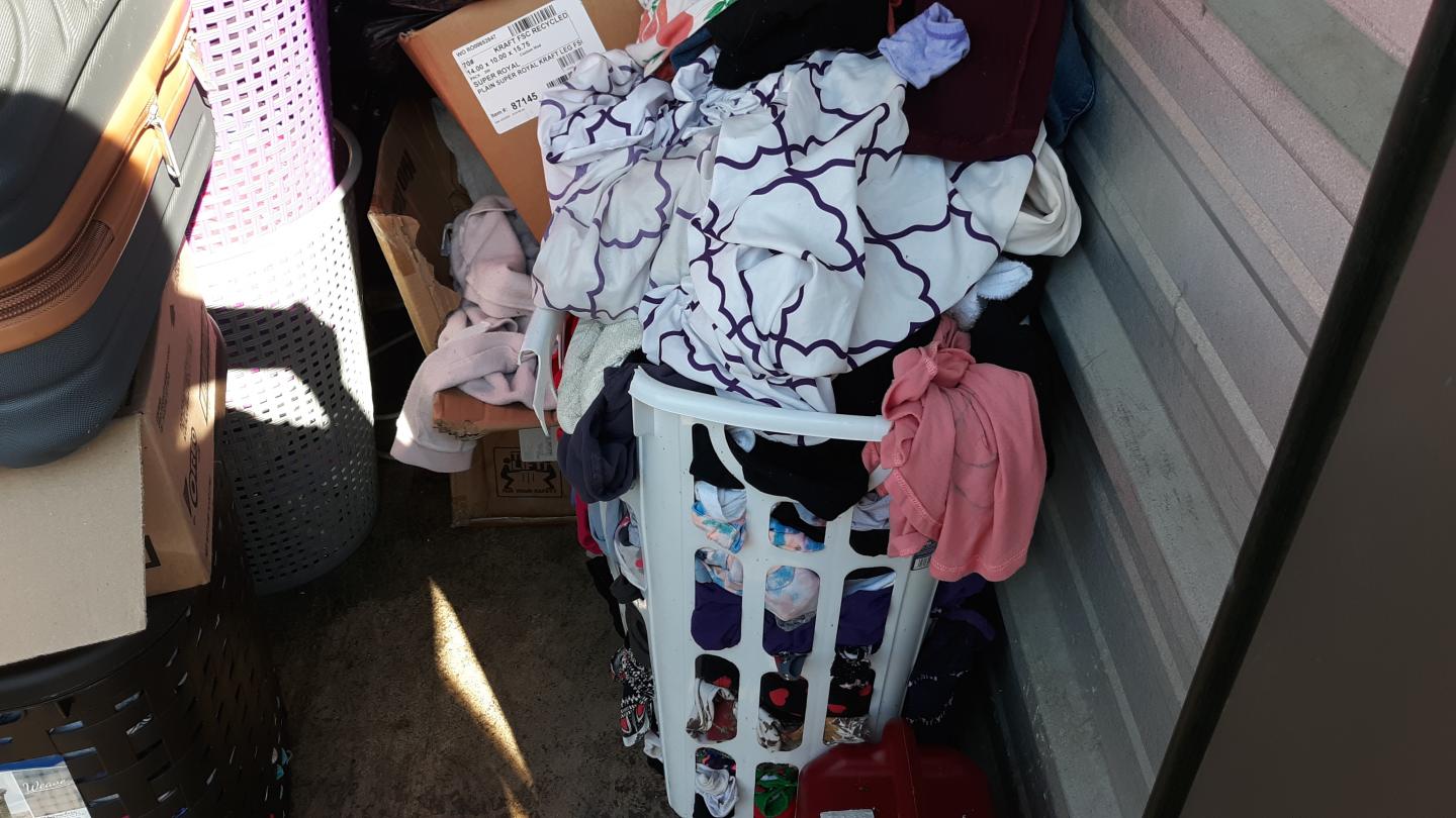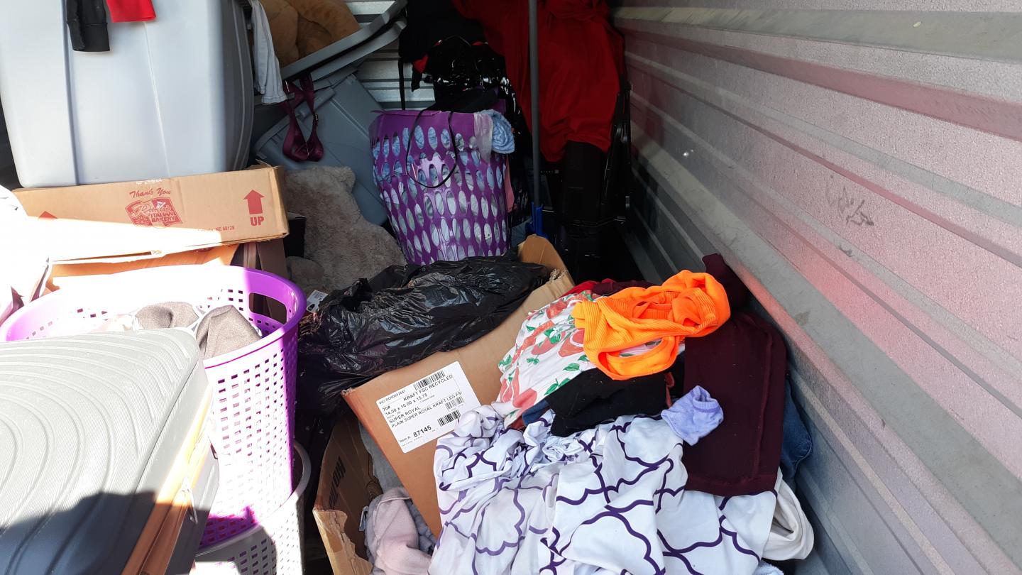 This unit appears to contain…TV Stand,Plastic Bags,Misc. Boxes,Clothing,Misc. Items,Suitcases,Laundry Baskets