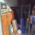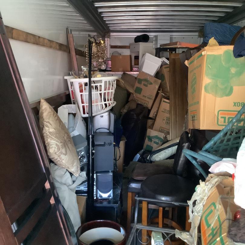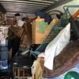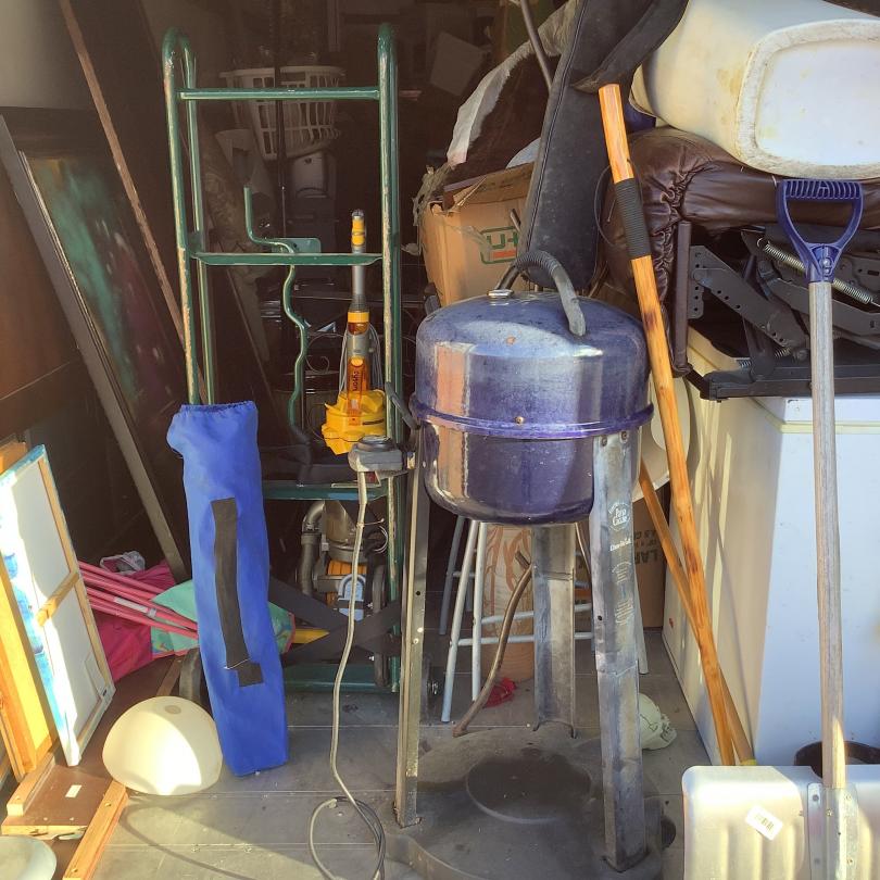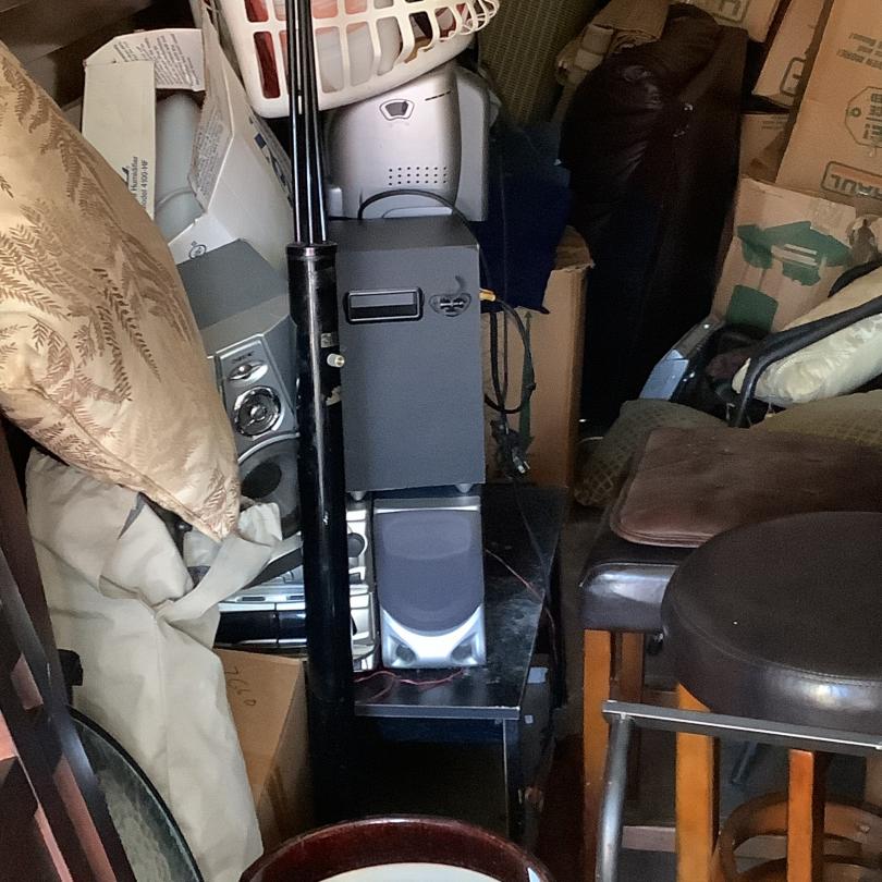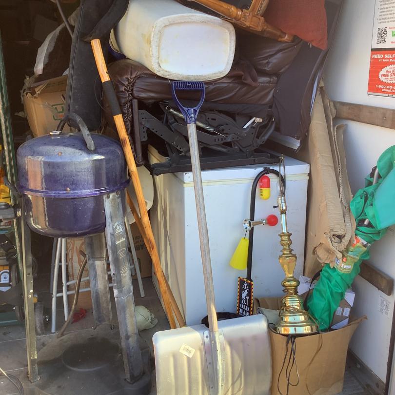 This unit appears to contain…Deep freezer, lamps, grill, recliner, snow shovel, appliance dolly, wall art, lamps, vacuum, bed frame, radios, speakers, stools, baskets, boxes