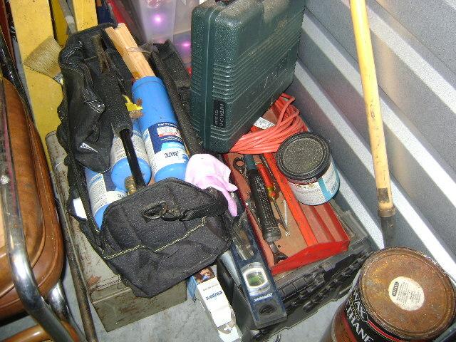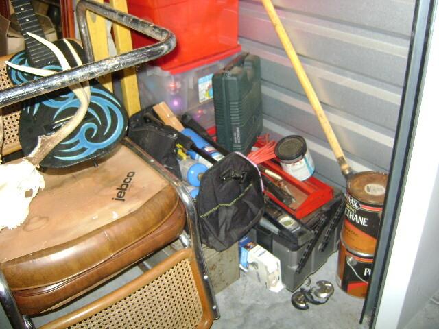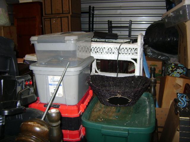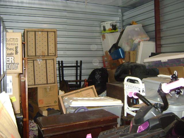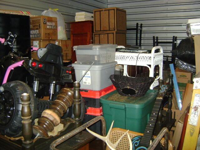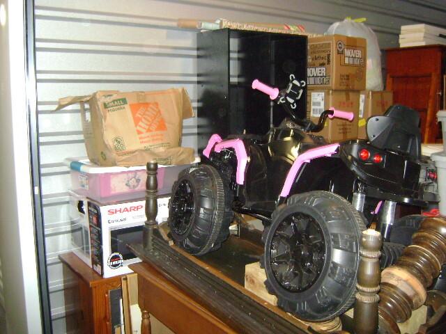 This unit appears to contain…furniture, child's power car, boxes, totes