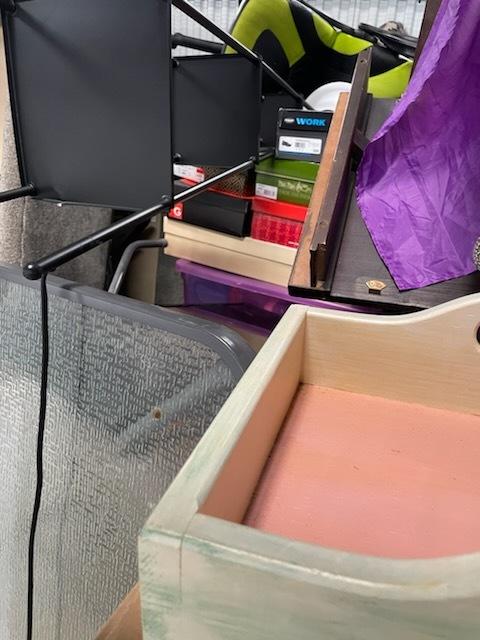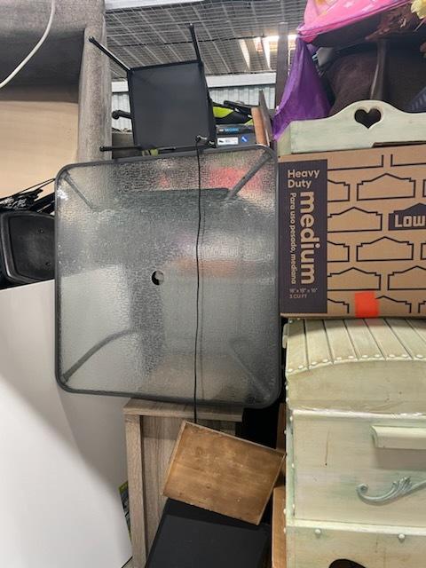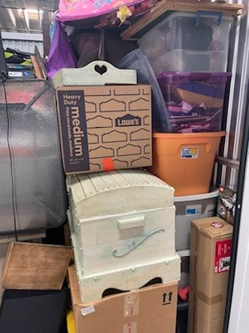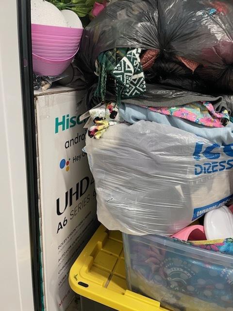 This unit appears to contain…black & white plastic bags, totes, couch, tv stand, chest, 65" Flat screen