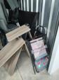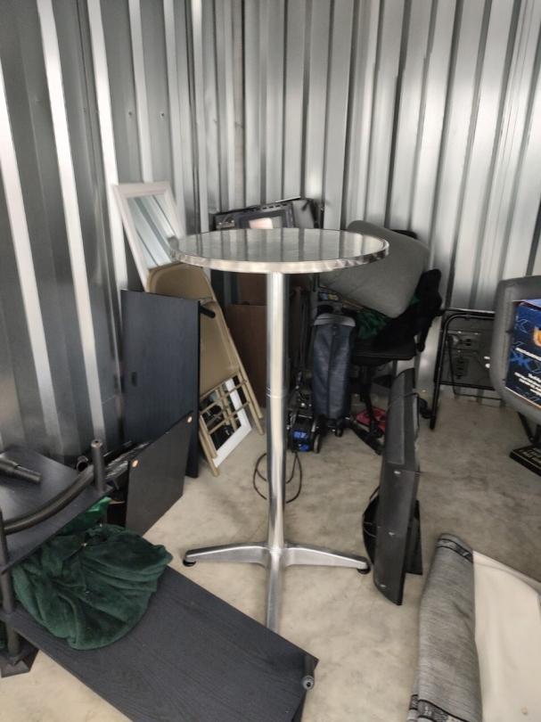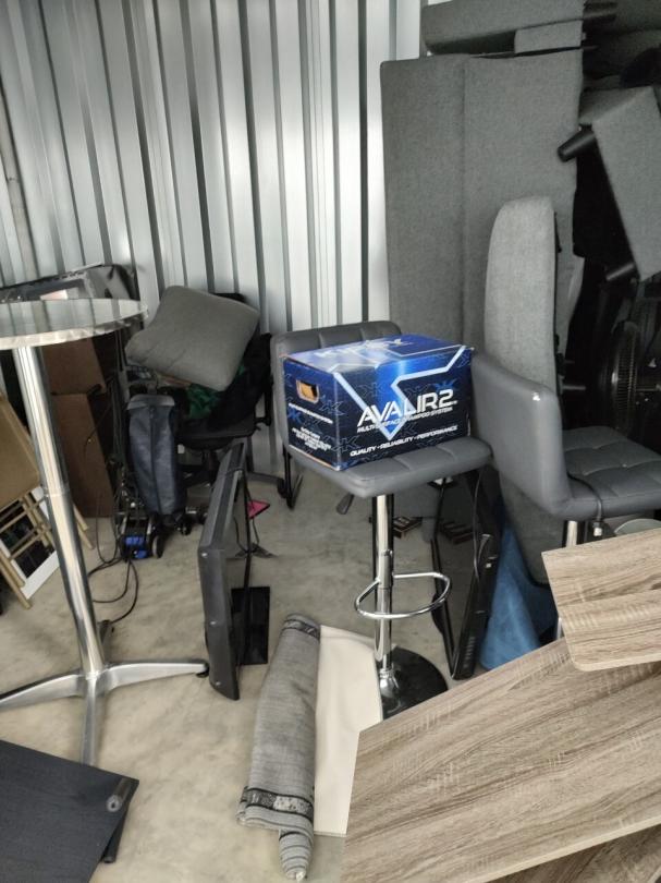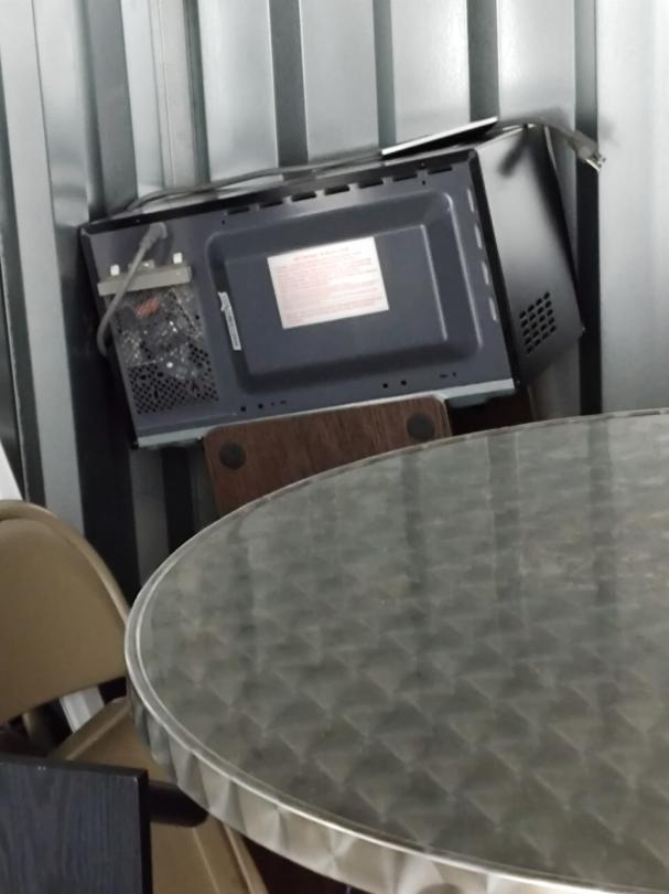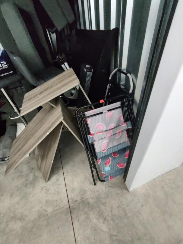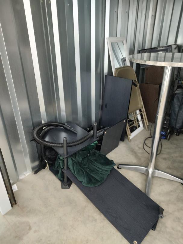 This unit appears to contain… This unit appears to contain tv's, microwave, couch, lamps, table, space heater, lawn chair, pedestal fan, stools, vacuum and a faux plant