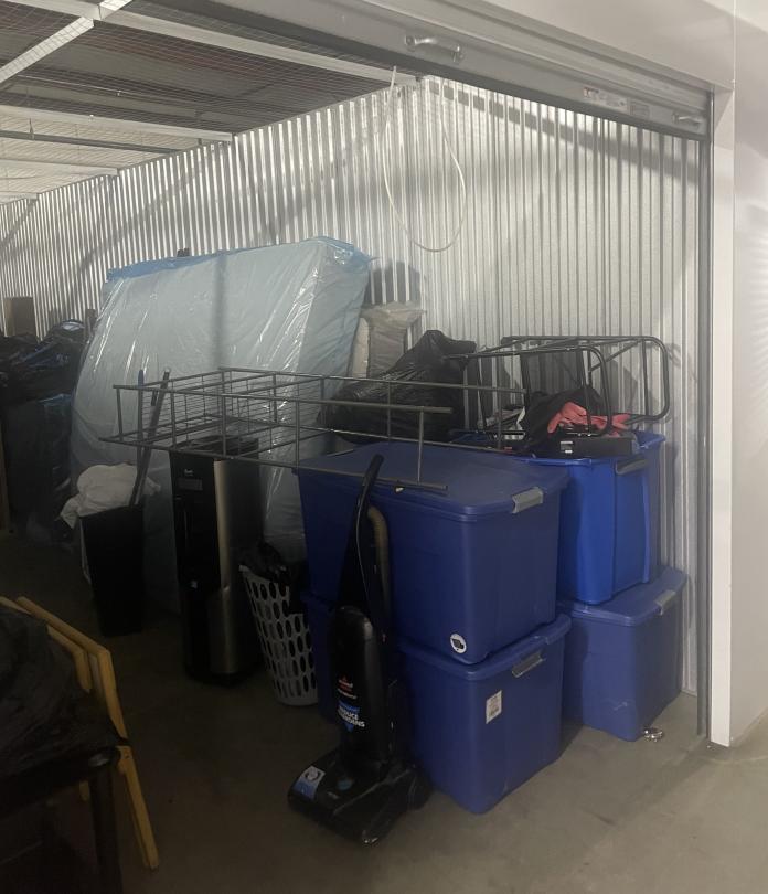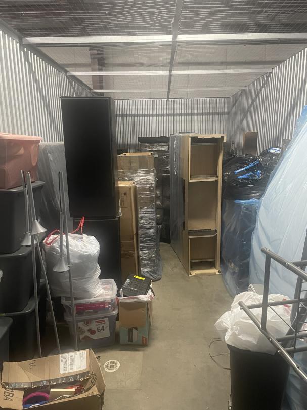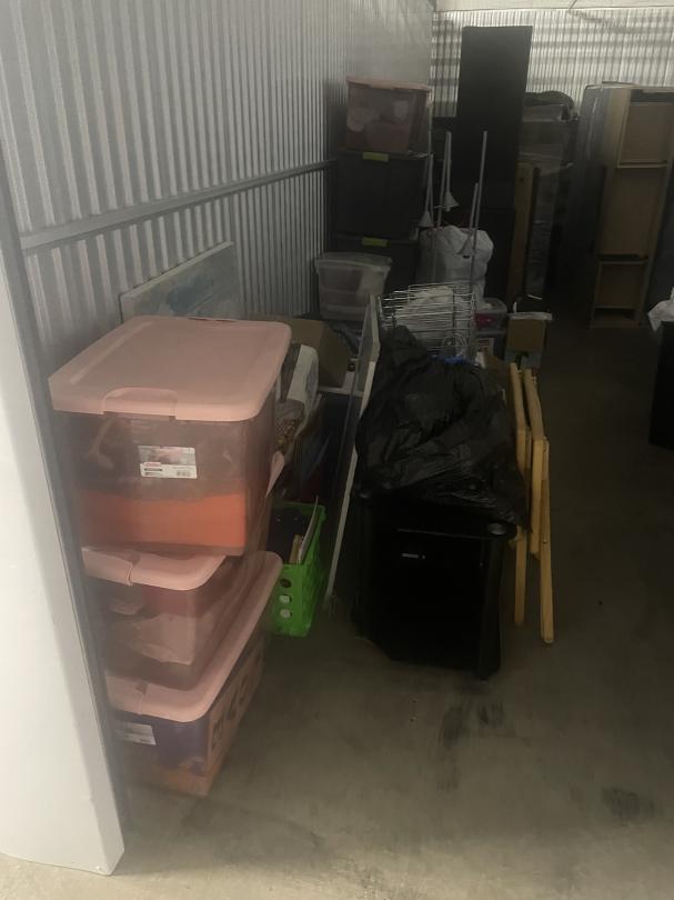 This unit appears to contain…bed frame, box spring, boxes, chairs, couch, dresser, home decor, kitchenware, lamps, mattress, plastic organizers, speaker, vacuum