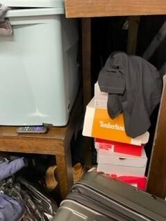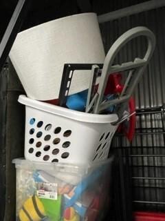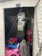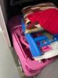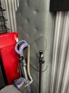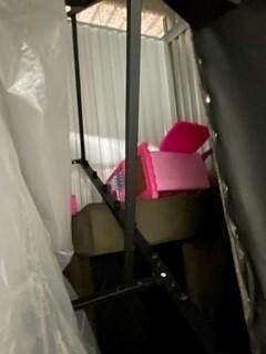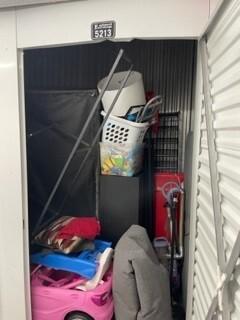 This unit appears to contain… hhgs, bed frame, rug, Powerwheel (pink Corvette) lamp, sofa, mattress, totes, toys, SHARK vacuum, shoe rack, pillows, bed, headboard
