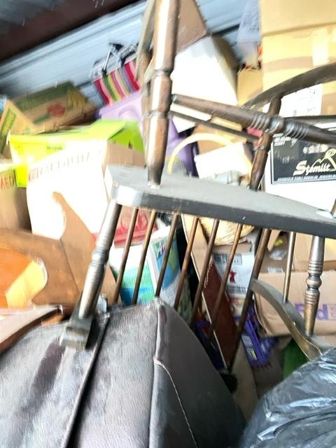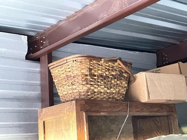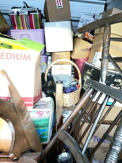 This unit appears to contain…Baskets, totes, bedframe, leather couch and chair. rocking chair, luggage, wood chairs, animal crate, laundry basket