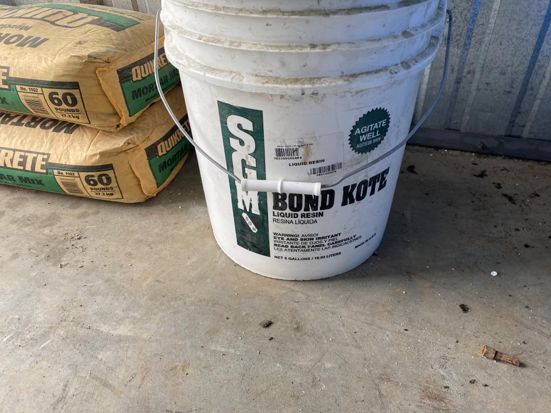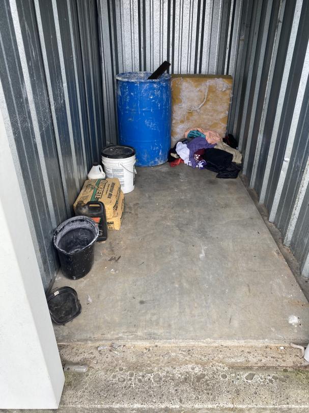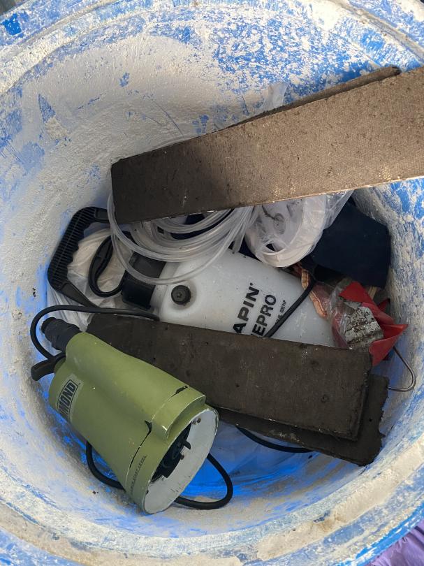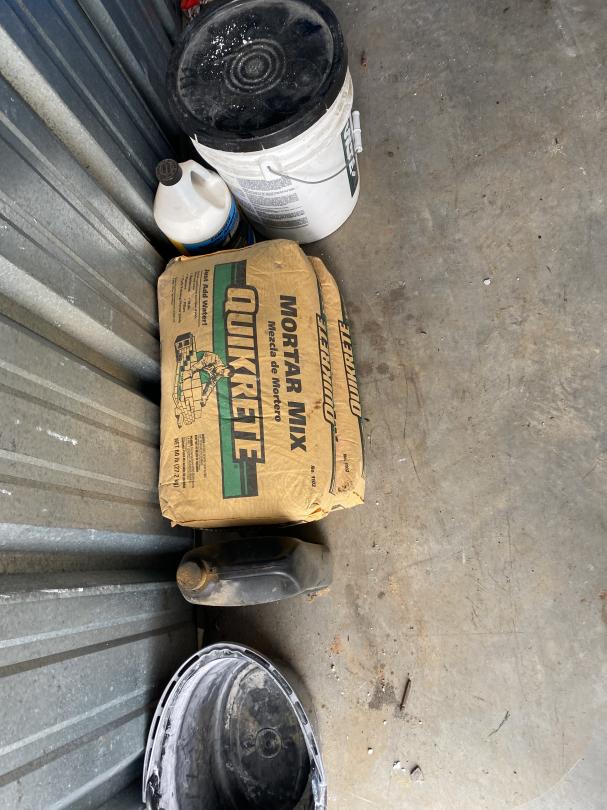 This unit appears to contain…Bug Sprayer, 2 bags of Quick Crete, Clothes, Bucket, Resin