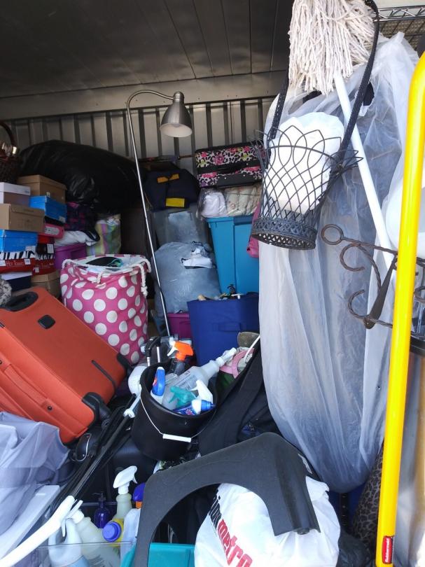This unit appears to contain…This unit appears to contain: totes, microwave, shoe boxes, bags, picture frame, shelves, suitcase, lamps, trash can, stereo, deep fryer, tire, miscellaneous items.