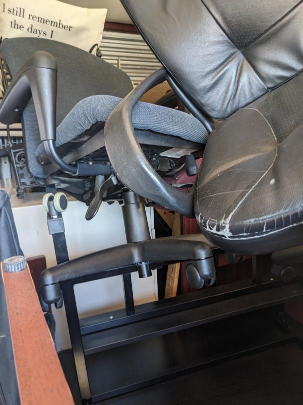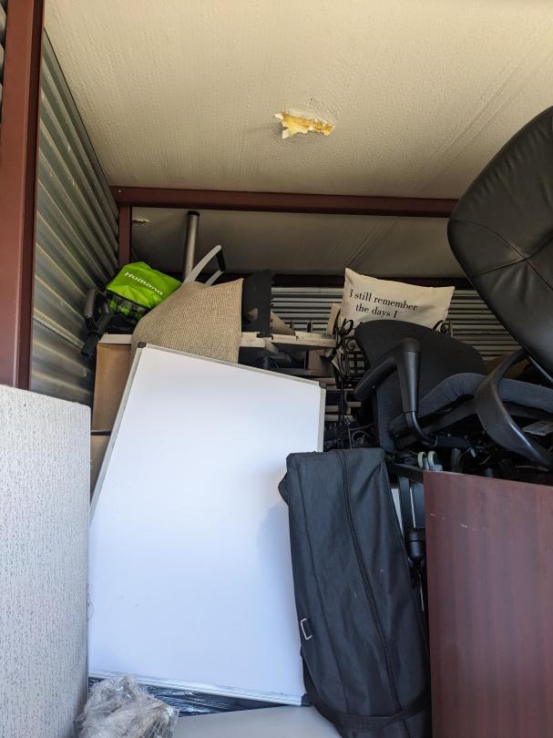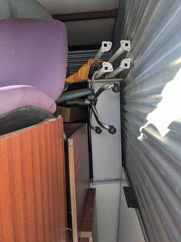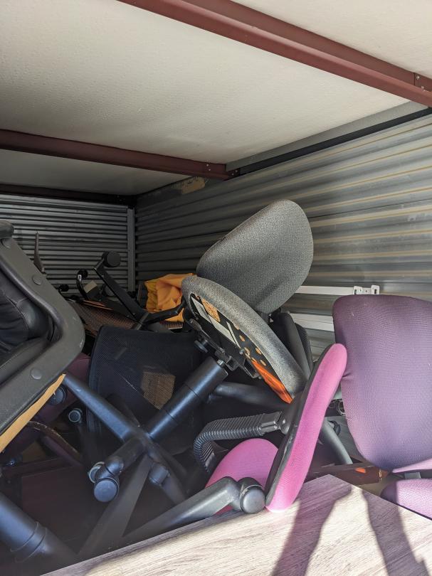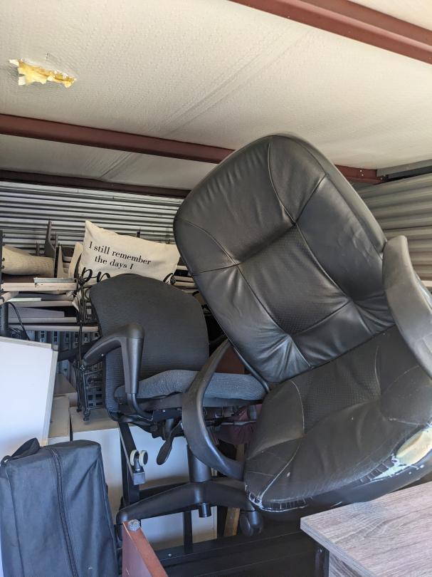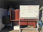 This unit appears to contain…unit appears to contain 6 office chairs shred container office desk wall divider ( polyester) filing cabinets office desk pop-up canopy tent dry erase boards rug