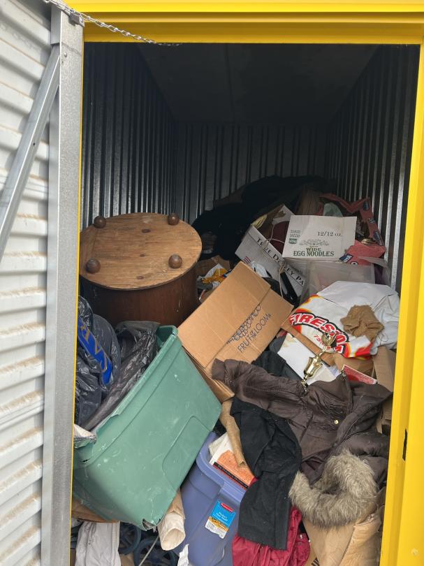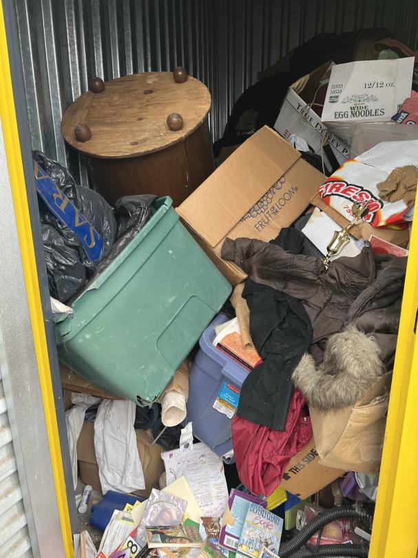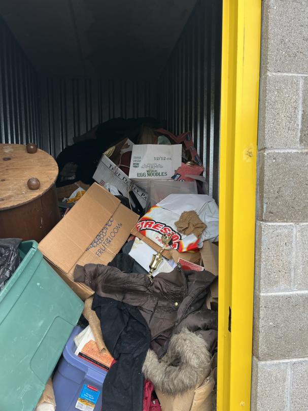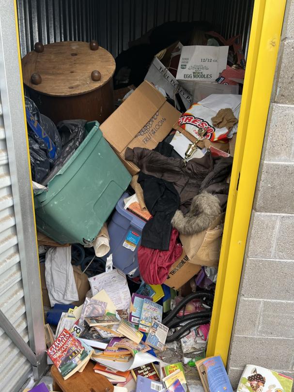 This unit appears to contain…Unit appears to contain, clothes, books, containers, coats, small table