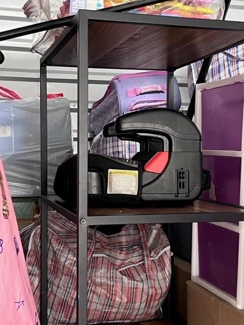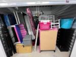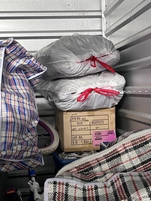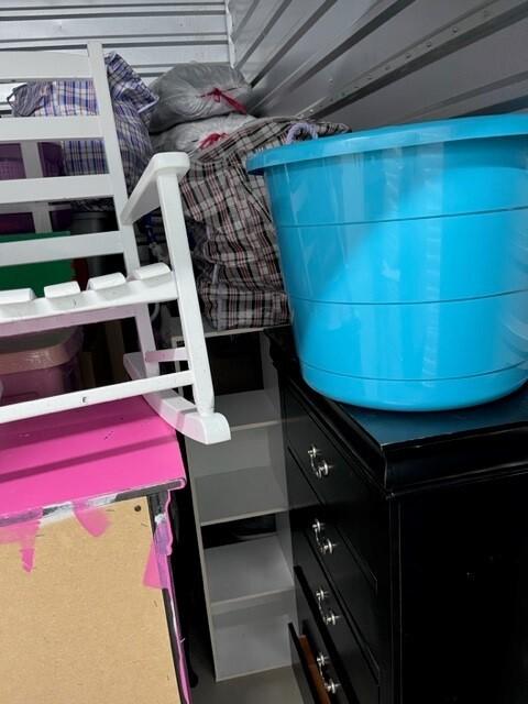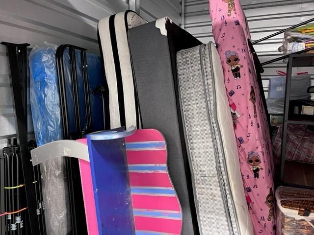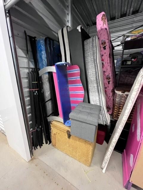 This unit appears to contain…2 chest of drawers, totes, bags, 3 mattresses, children's toys, children's bikes, clothes hampers, tv stand, metal shelf, Storage cubby