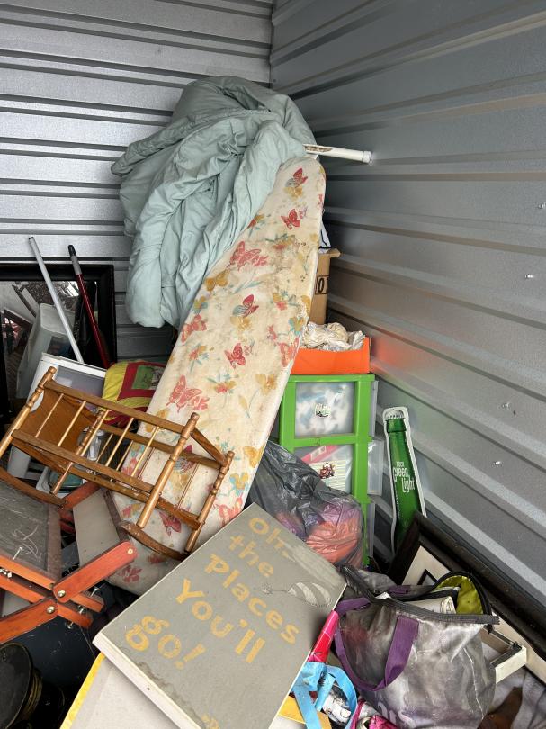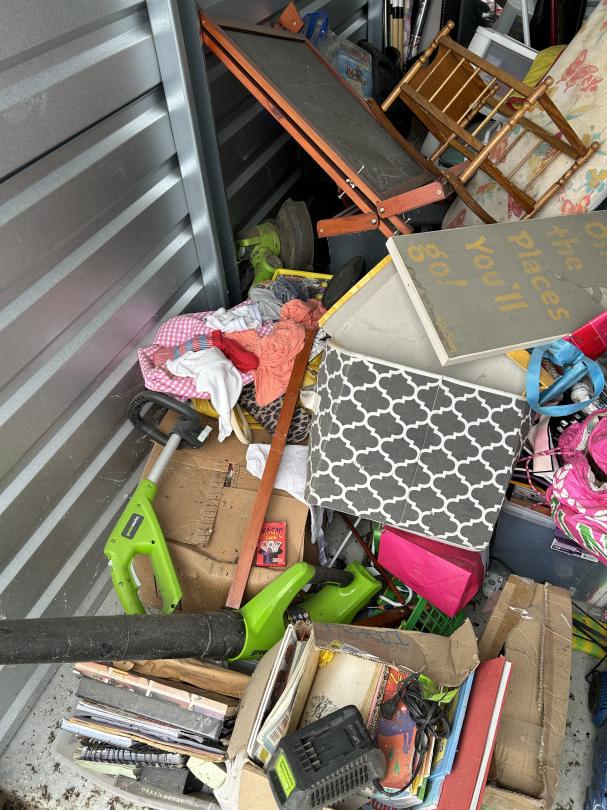 This unit appears to contain…Unit appears to contain household goods, tools, books, and miscellaneous items.