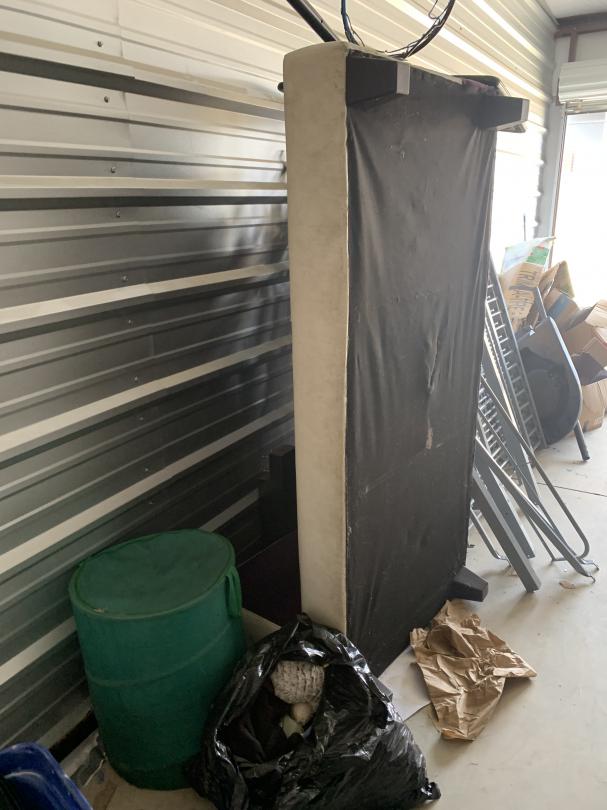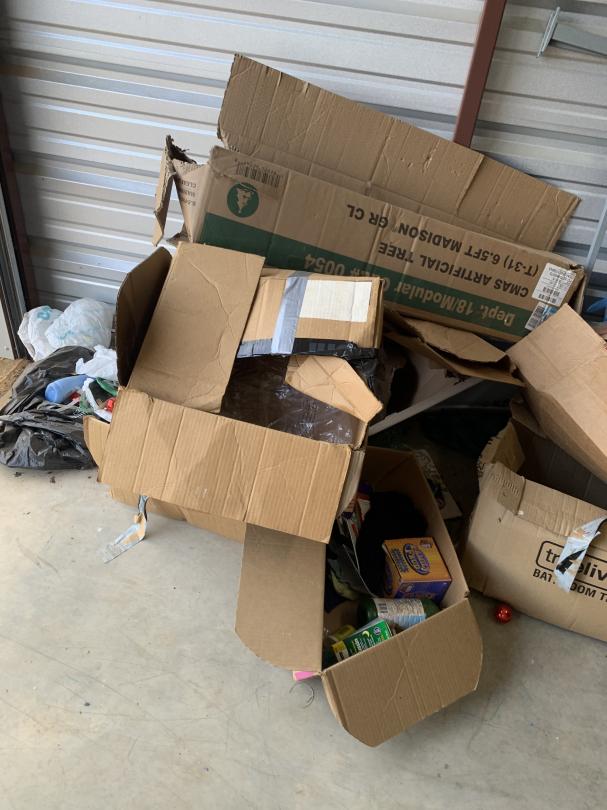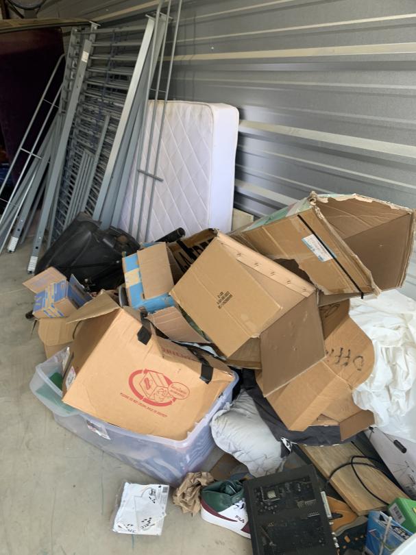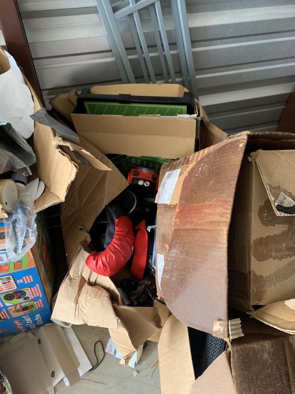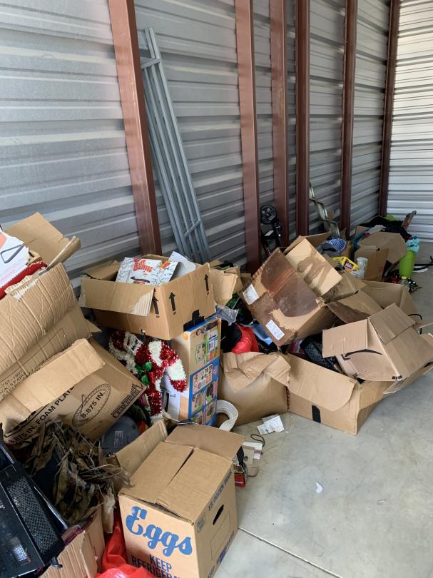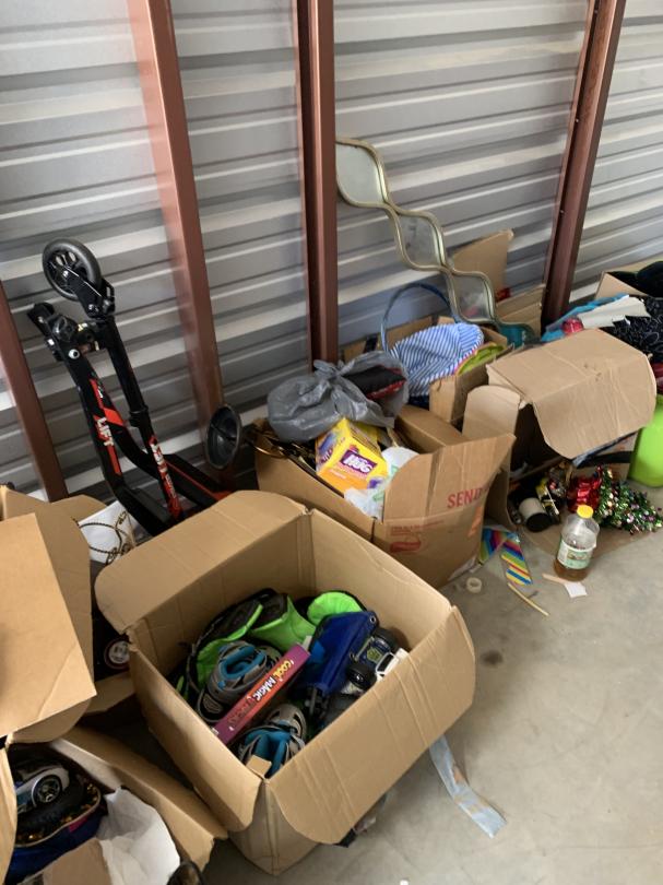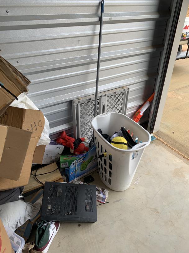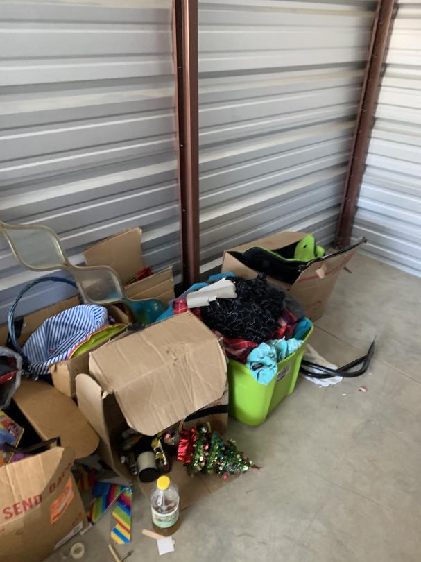 This unit appears to contain…Boxes, Totes, Holiday Decorations, Games, Toys, Electronics, Basketball Goal, Crib, Sports Equipment, Couch