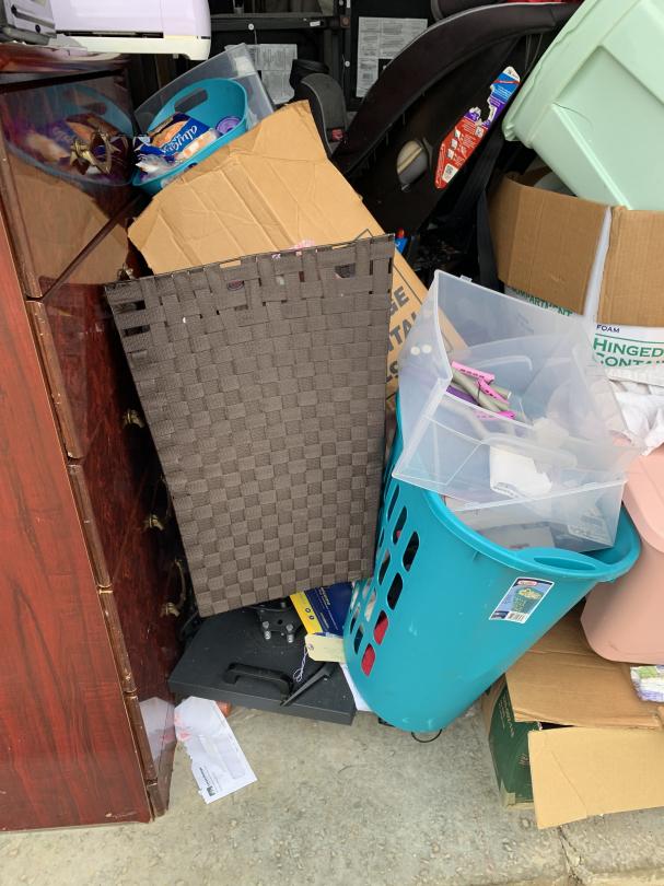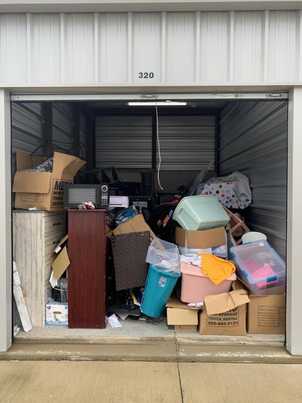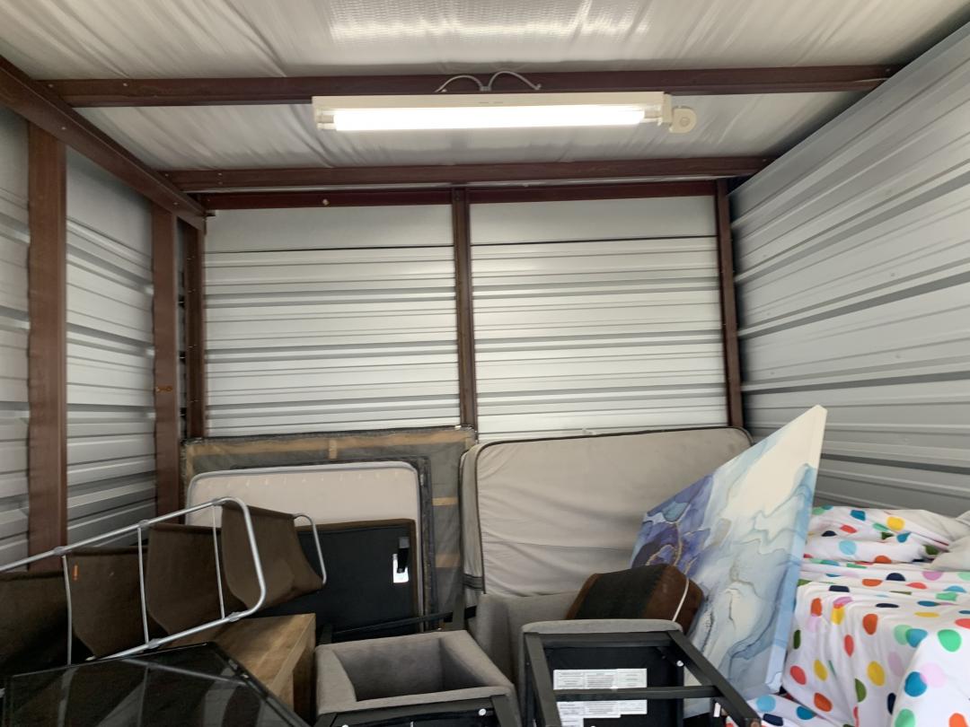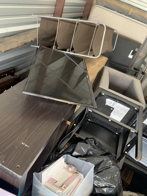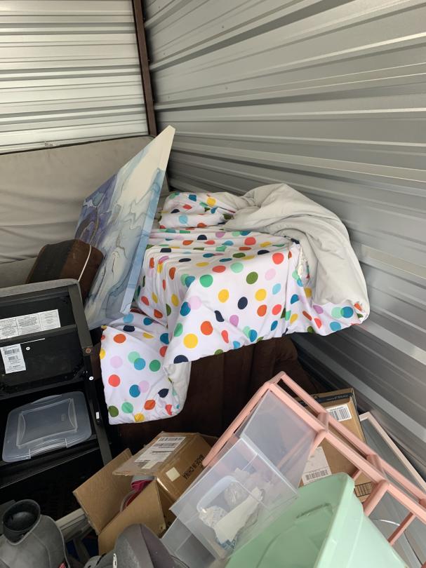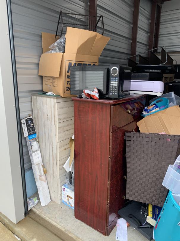 This unit appears to contain…Microwave, Boxes, Totes, Dressers, Flat Screen TV, Mattresses, Box Springs, Chairs, Organizers, Car Seat, Paintings, Clothes, Shoes