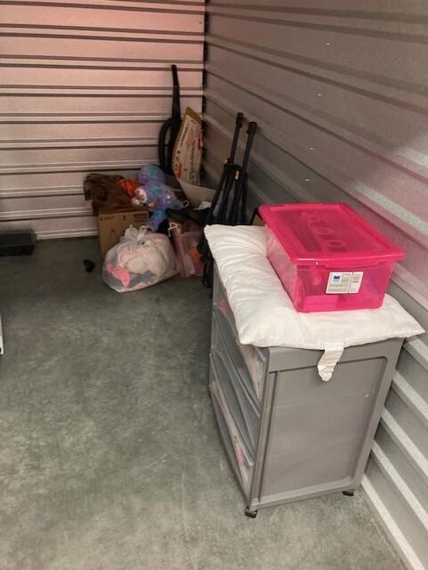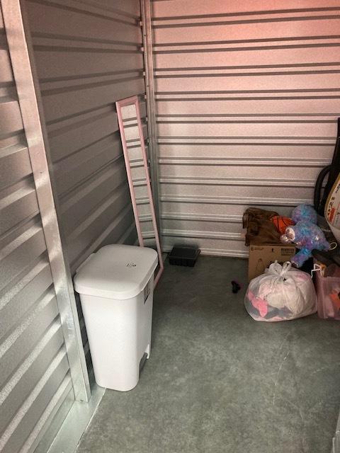 This unit appears to contain…plastic bins, pillow, vacuum, boxes, bags, mirror, trash can