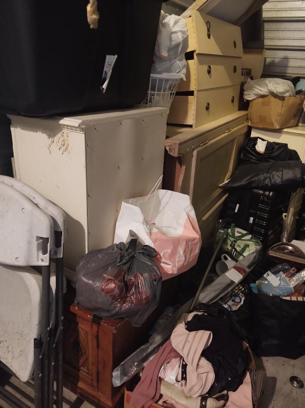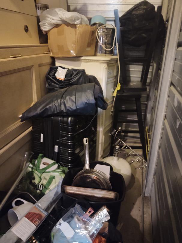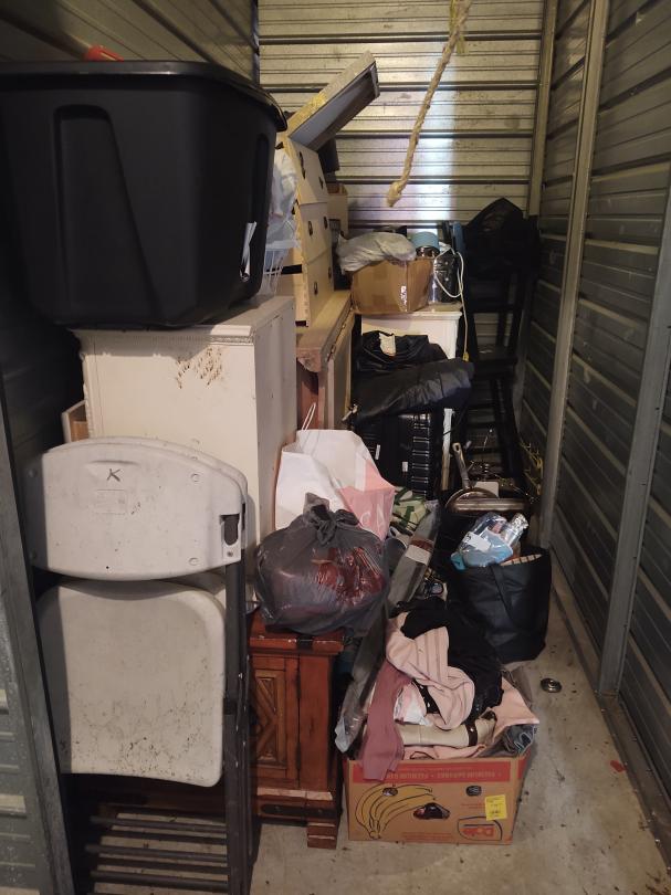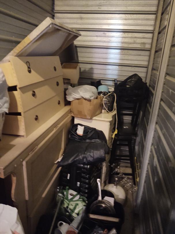 This unit appears to contain…Folding chairs, dresser, night stand, clothing, HHG