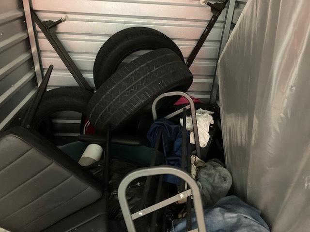 This unit appears to contain…chairs, box spring, luggage, plastic totes, clothes, bags, bed rails, shoe rack, tires, blankets