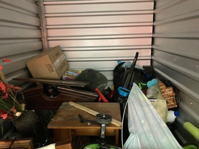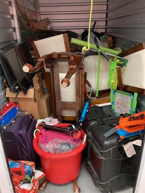 This unit appears to contain…side tables, luggage, toys, tvs, chairs, boxes, bags, vacuum, baskets, vase, pool noodle