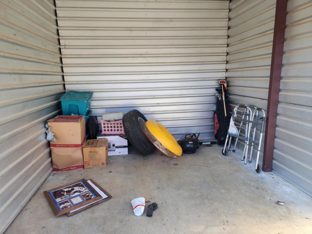 This unit appears to contain…Unit appears to contain Echo chainsaw, framed baseball card, boxes, tire & wheel, inner tube, walker, golf clubs