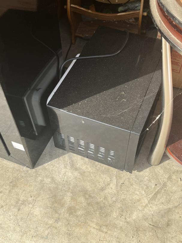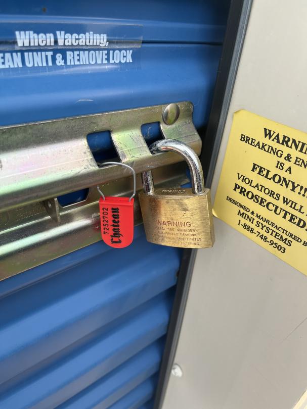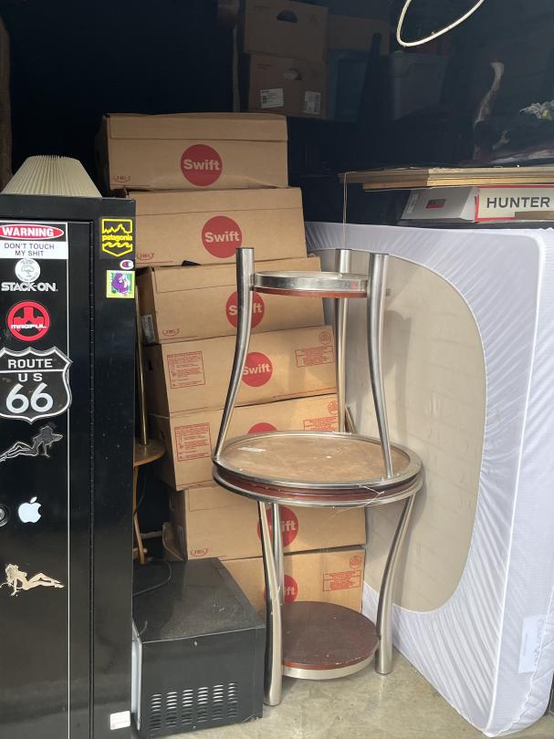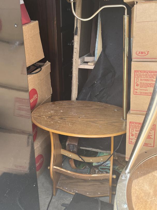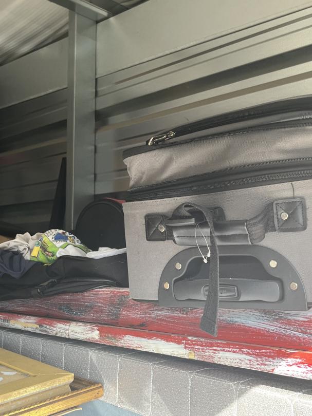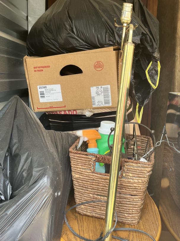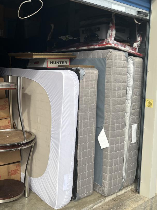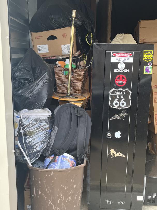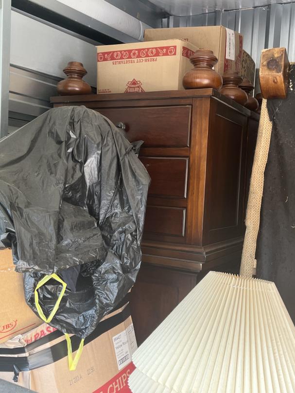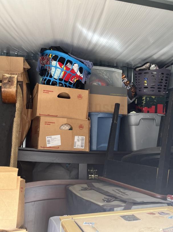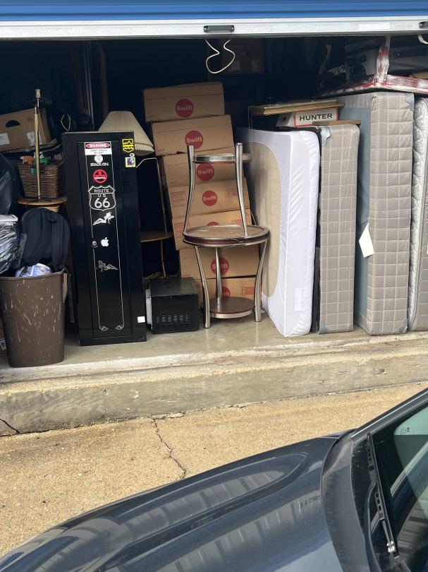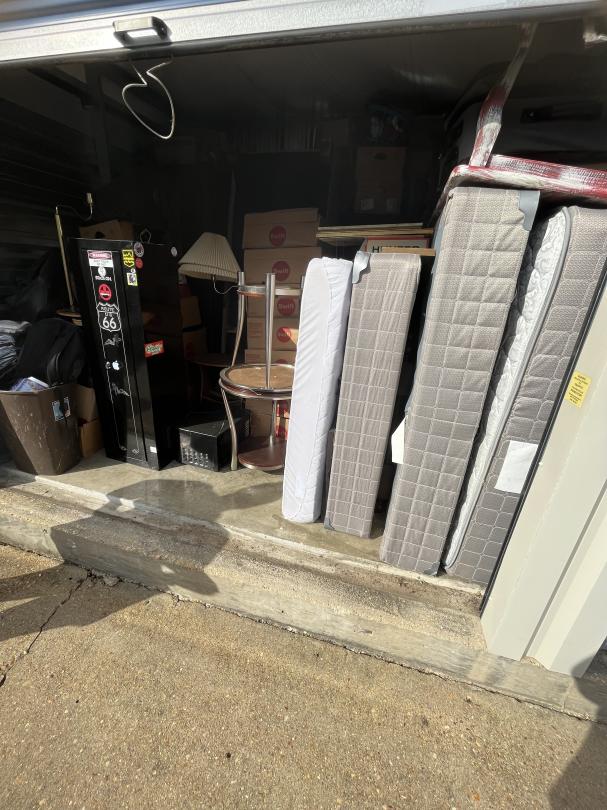 This unit appears to contain…Drive-Up Storage boxes, bags, box springs, mattress, lamp, gun safe, end table, clothes basket, totes, couch, microwave, coffee table