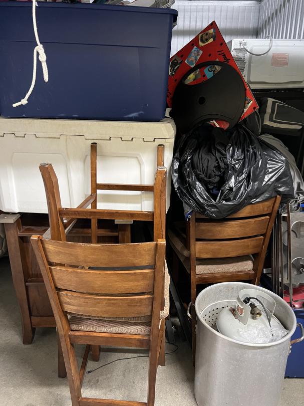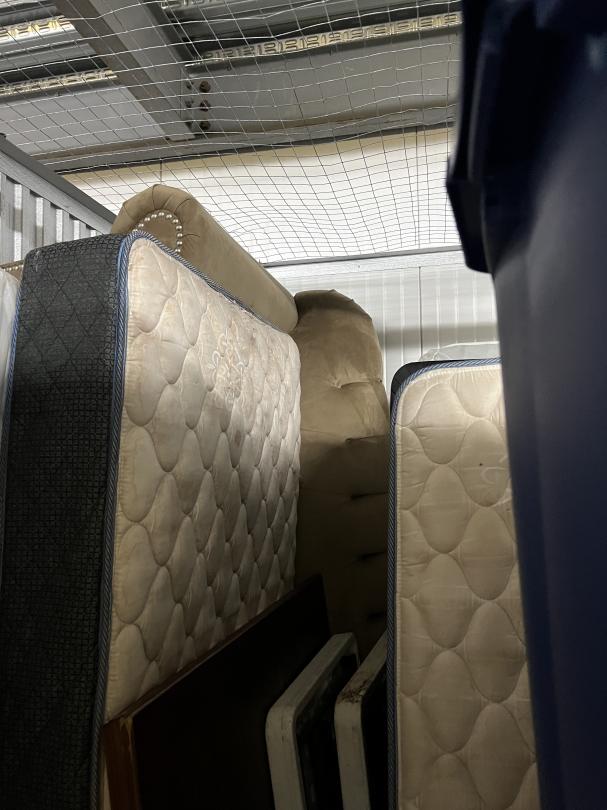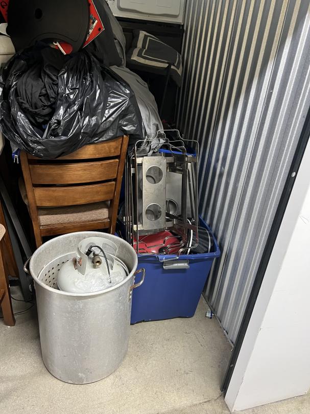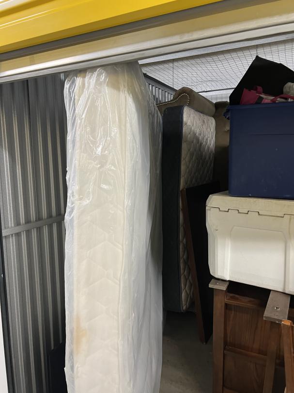This unit appears to contain…Mattress (4), Ice Chest, Totes, Crawfish Pot, Box Spring (2), Microwave, Chairs, Freezer, Bed Frame, Sofa, Table, End Table, Folding Table (2), Dresser, Boxes. .