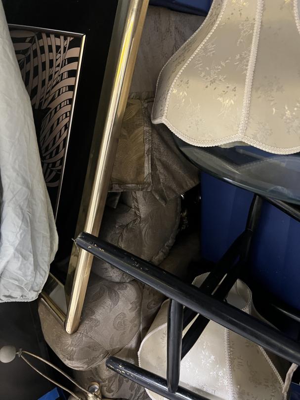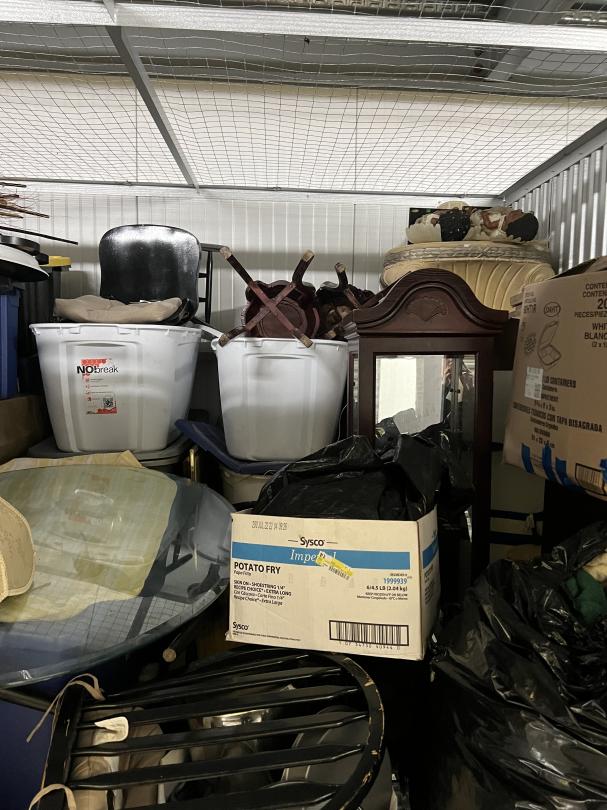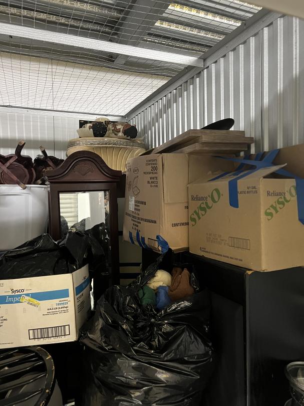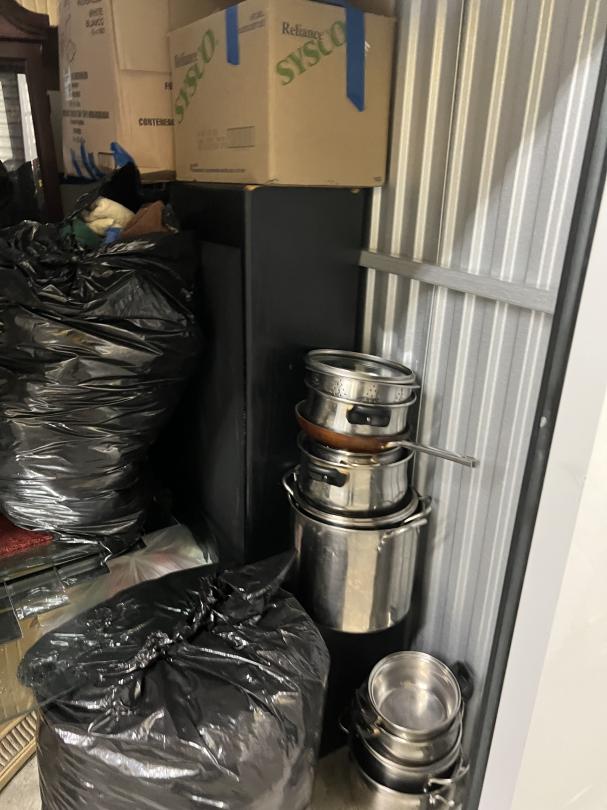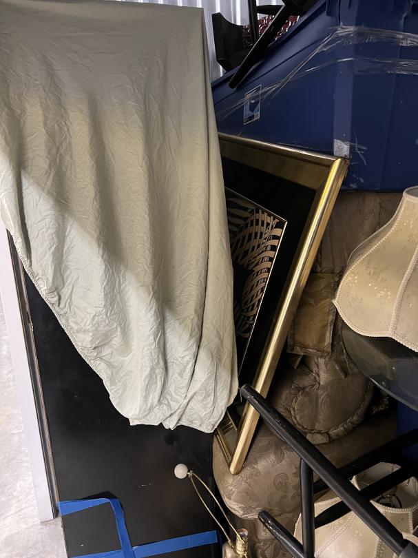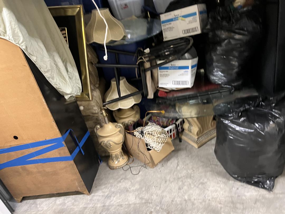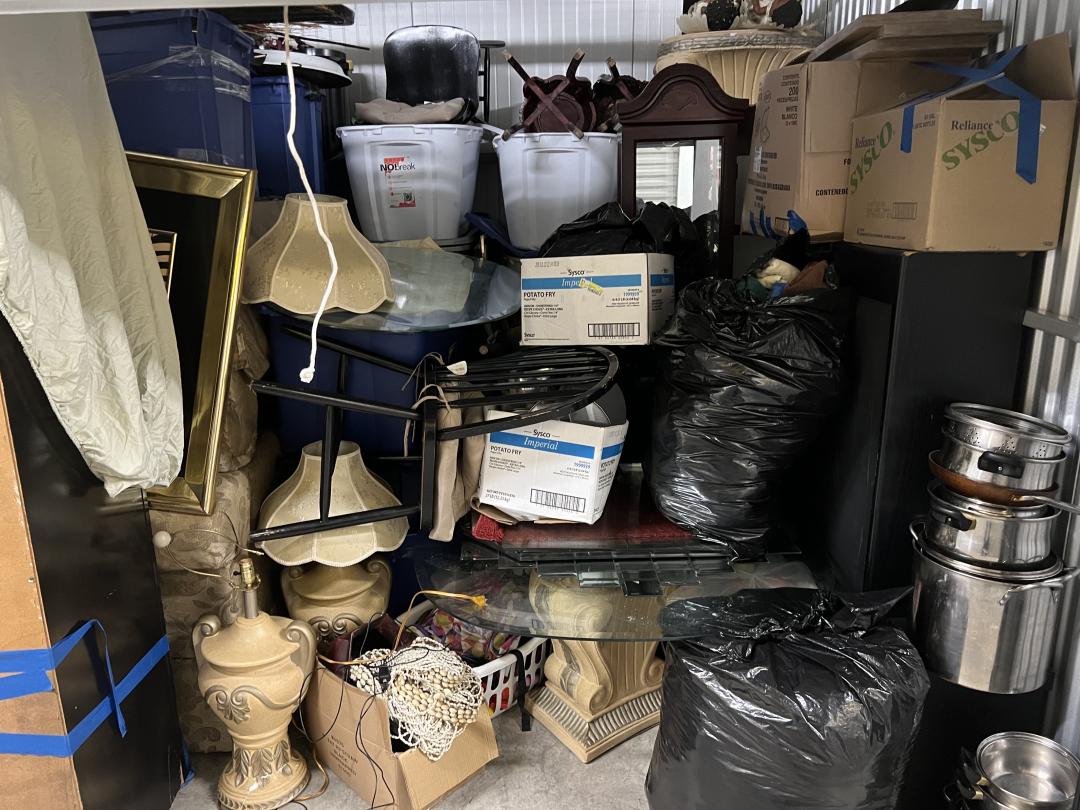 This unit appears to contain…Sofa, Love Seat, Pictures, Lamps, Boxes, Pots and Pans, Bags, Glass Table, Wood Plant Stands, Mirror, Fake Plant.