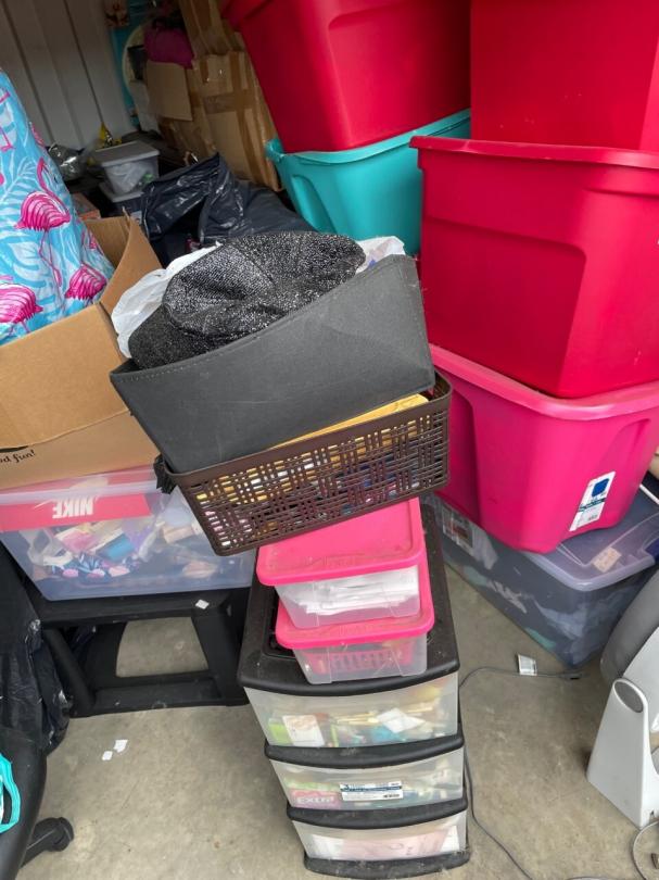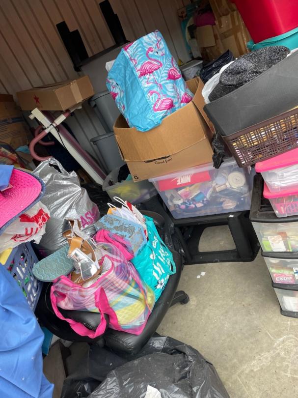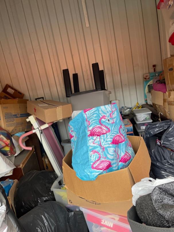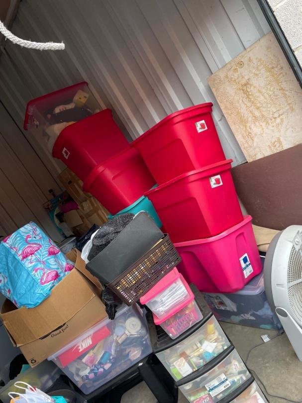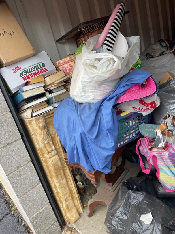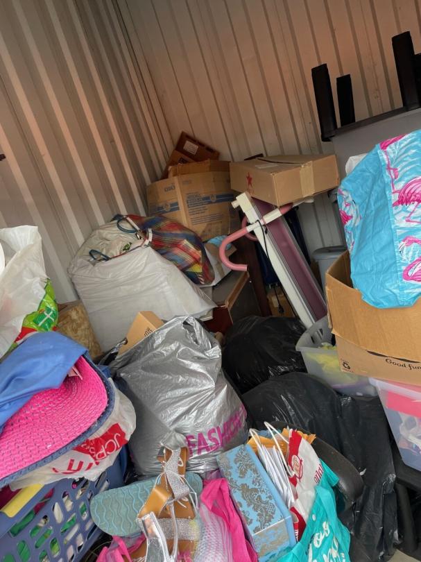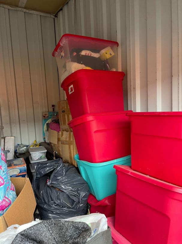This unit appears to contain…Unit appears to contain, hampers, clothes, firepit, totes, boxes, bags.