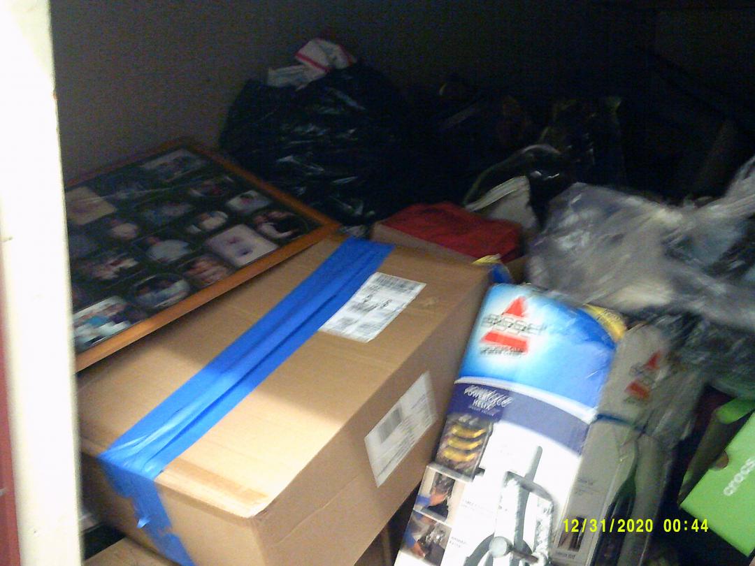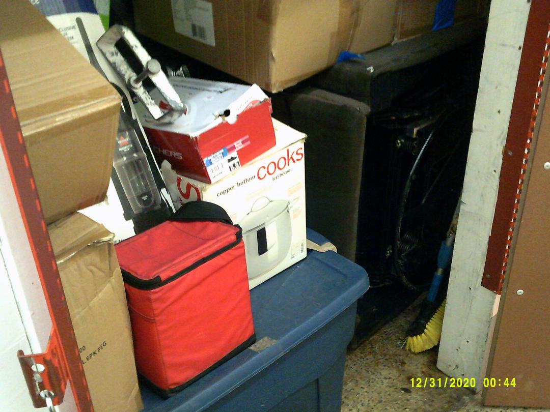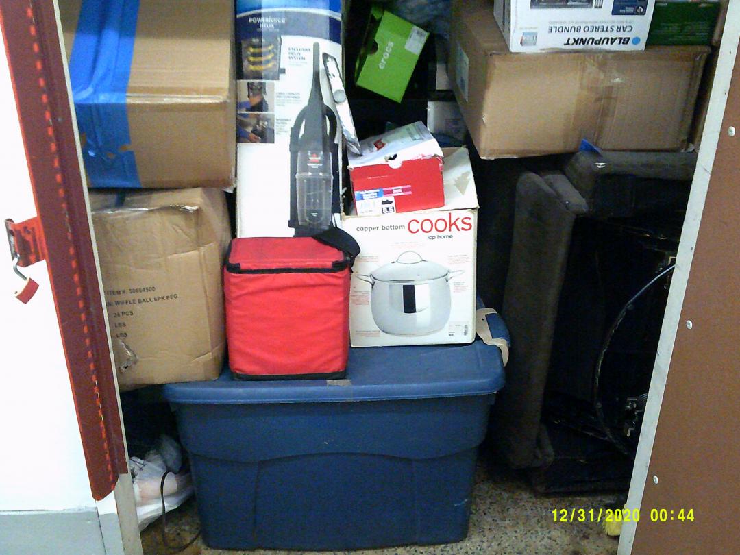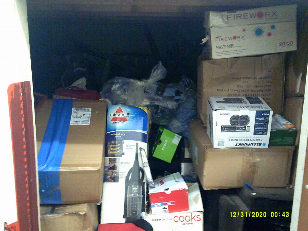 This unit appears to contain…READ ALL AUCTION RULES BEFORE BIDDING! Unit appears to contain: boxes, totes, bags, recliner, dining room chairs