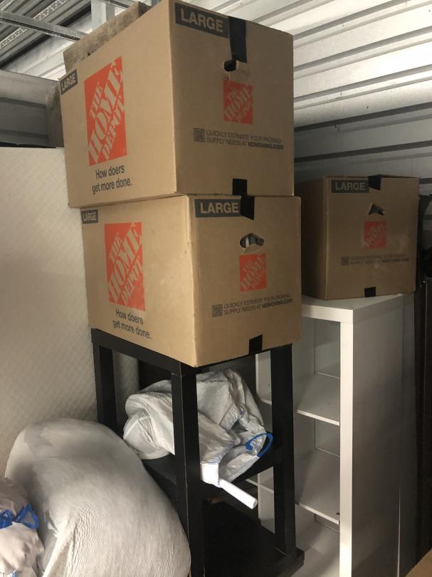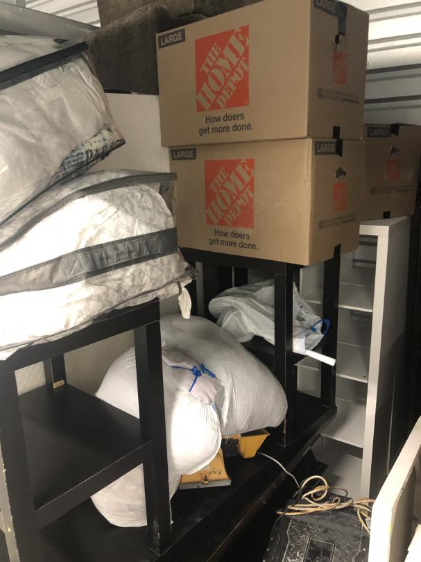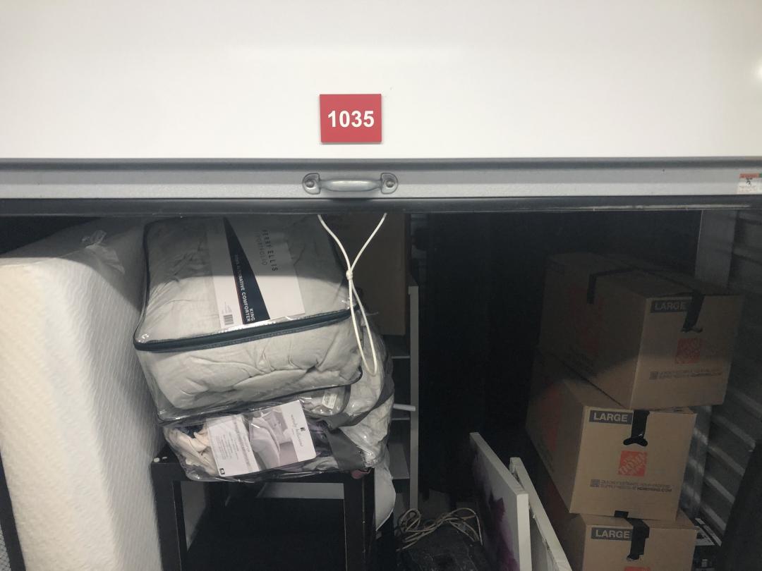 This unit appears to contain…Bedding, mattress, boxes, wall art, shelving units, chairs, furniture
