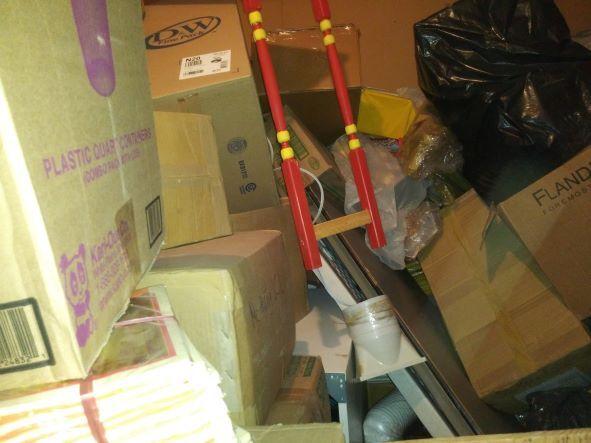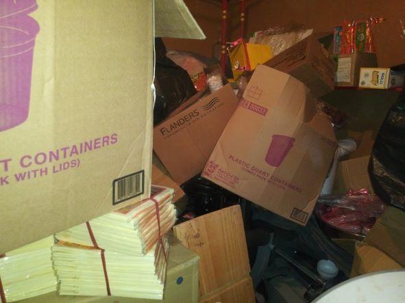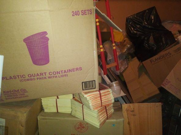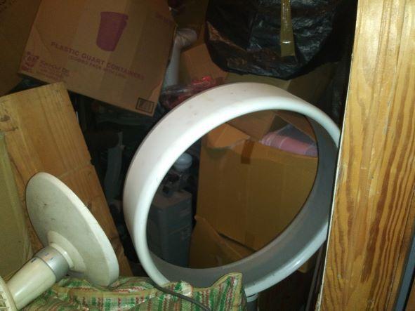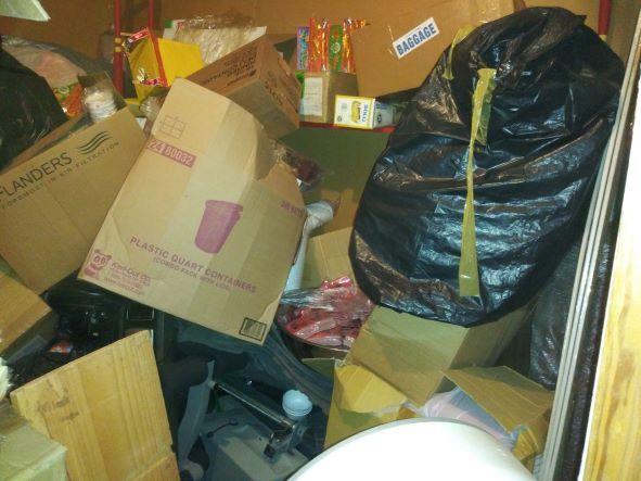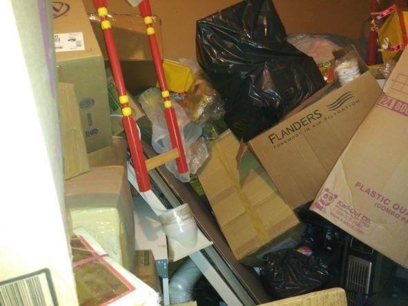 This unit appears to contain…Unit appears to contain: tables, decor, plastic bags, misc. boxes, exercising equipment, fan