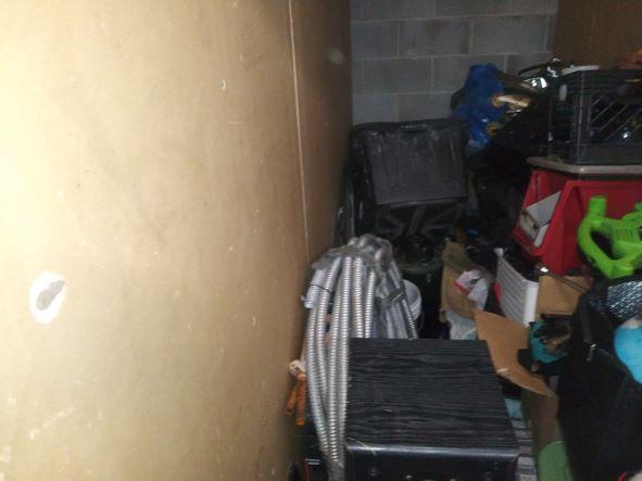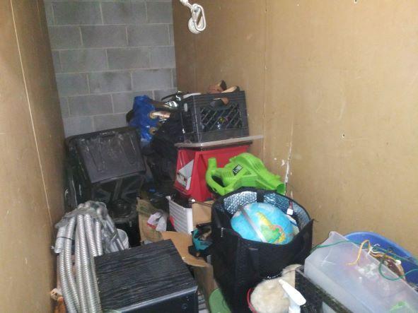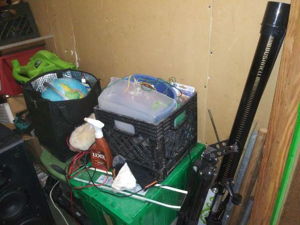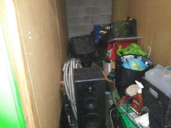 This unit appears to contain…Unit appears to contain: plastic containers, crates, speaker, camera stand