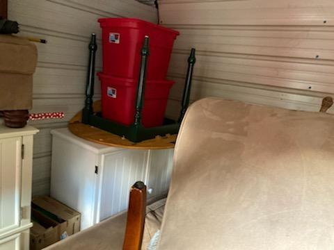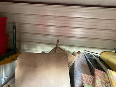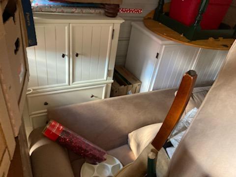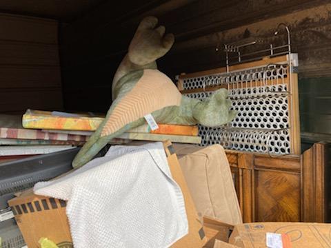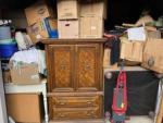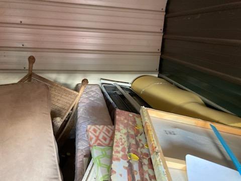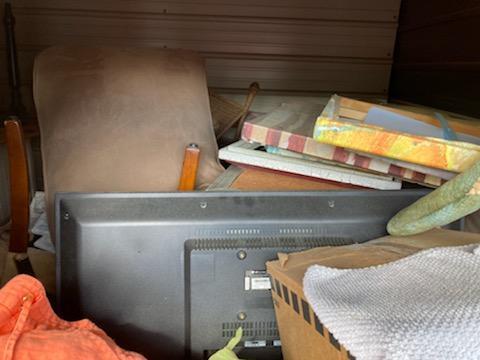 This unit appears to contain…vacuum cleaner, various pieces of furniture, lots of boxes, plastic storage bins, mattresses, bed, TV, pictures, stuffed animal (dinosaur) and much more.
