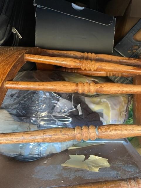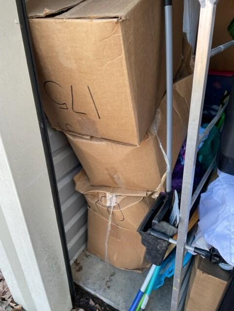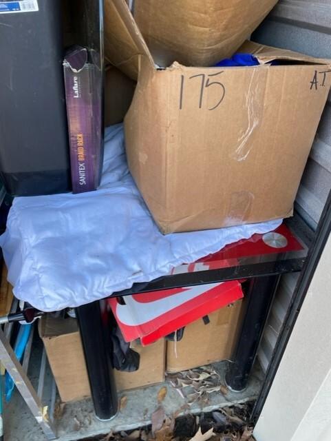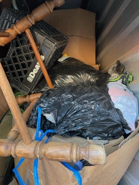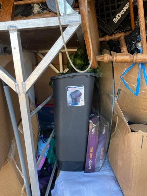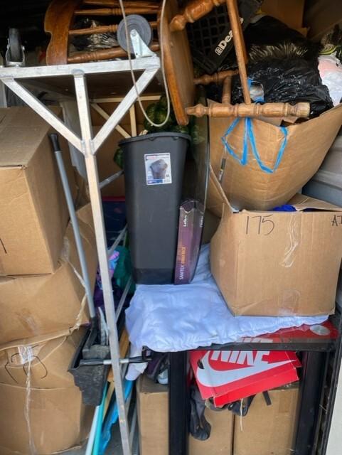 This unit appears to contain…Chairs,Tables,Plastic Bags,Misc. Boxes,Misc. Items,Suitcases