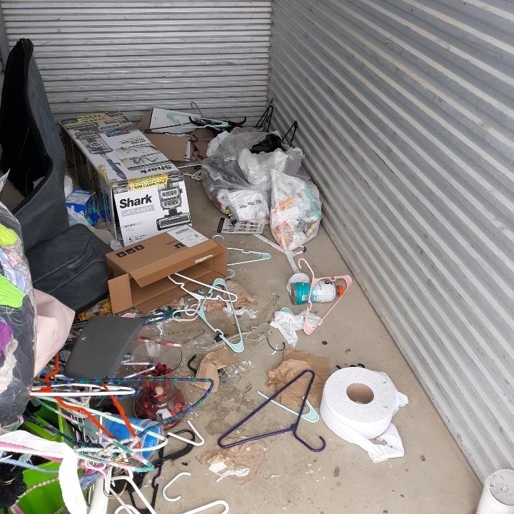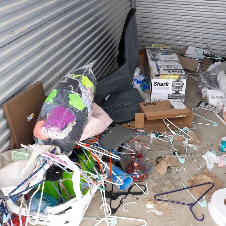 This unit appears to contain…This unit appears to contain hangers, empty boxes, bag of clothes, vase, misc.