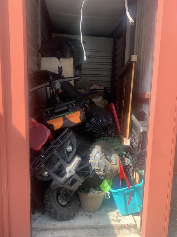 This unit appears to contain…Kids toys, kids quad, mattress, box spring, bags, totes