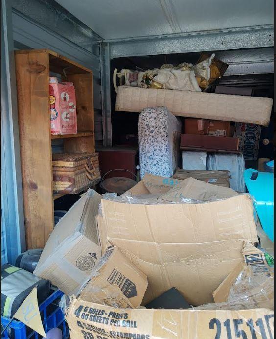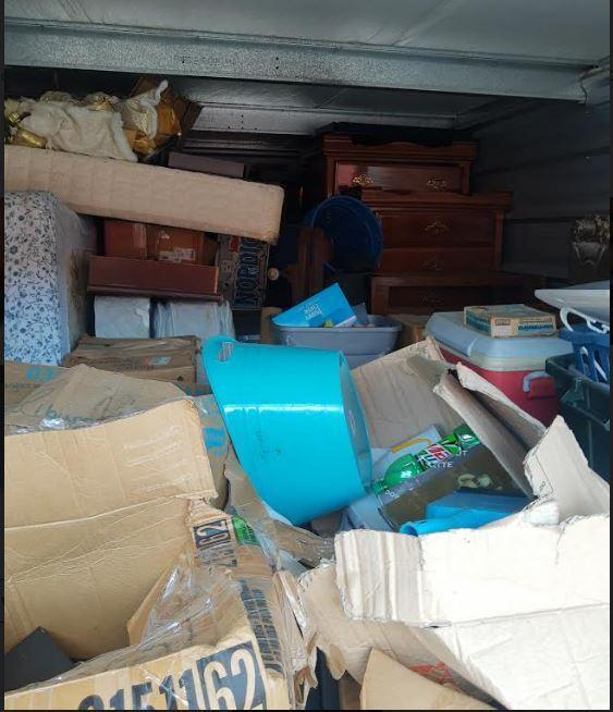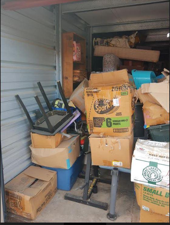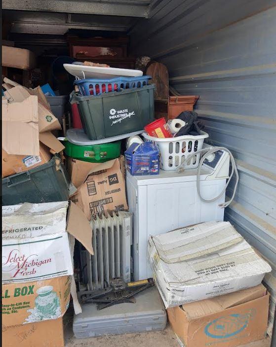 This unit appears to contain…Furniture, Totes, Several Filled Boxes, Car Jack, Bedding, Space Heater, Washer and Dryer