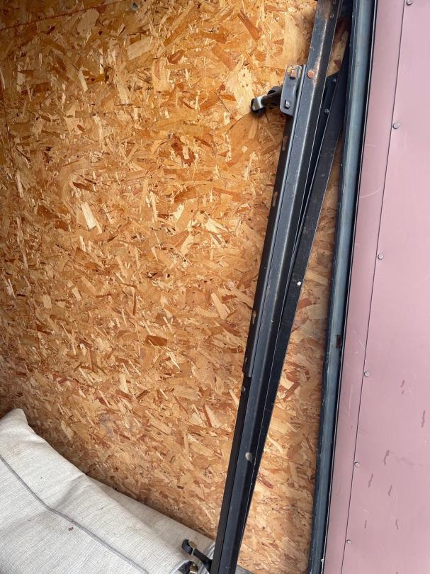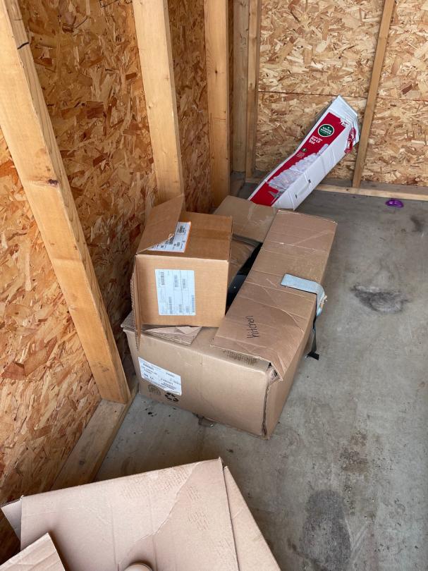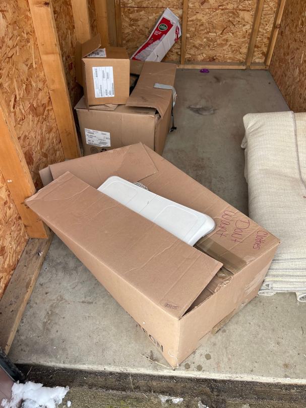 This unit appears to contain…Metal bed frame, Beige Rug, White Pre-lit Christmas tree, Boxes