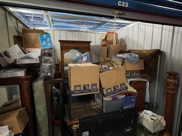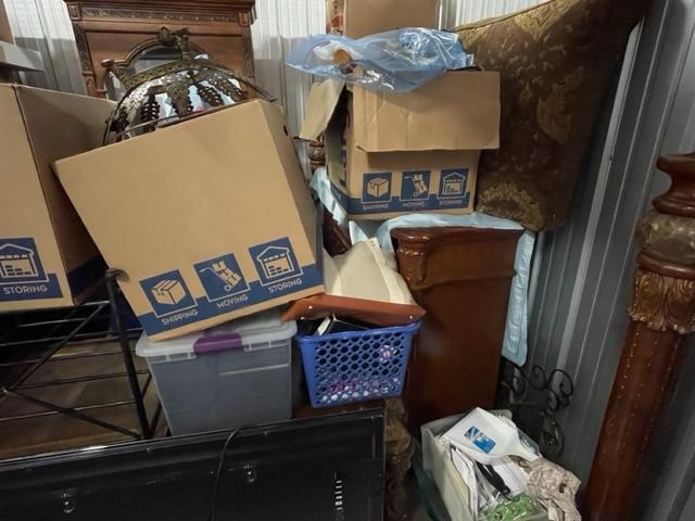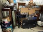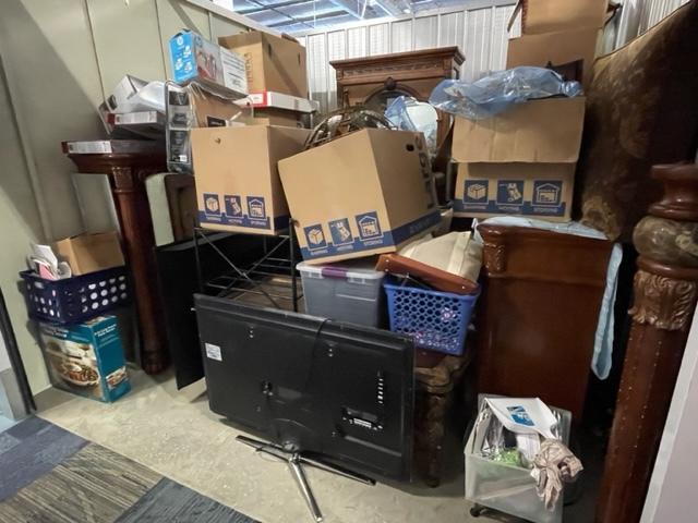 This unit appears to contain…Television, mirrors, boxes, totes, bedroom set, etc.