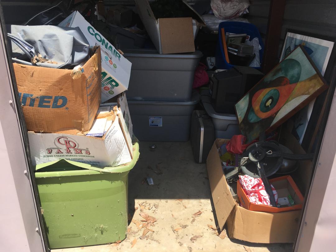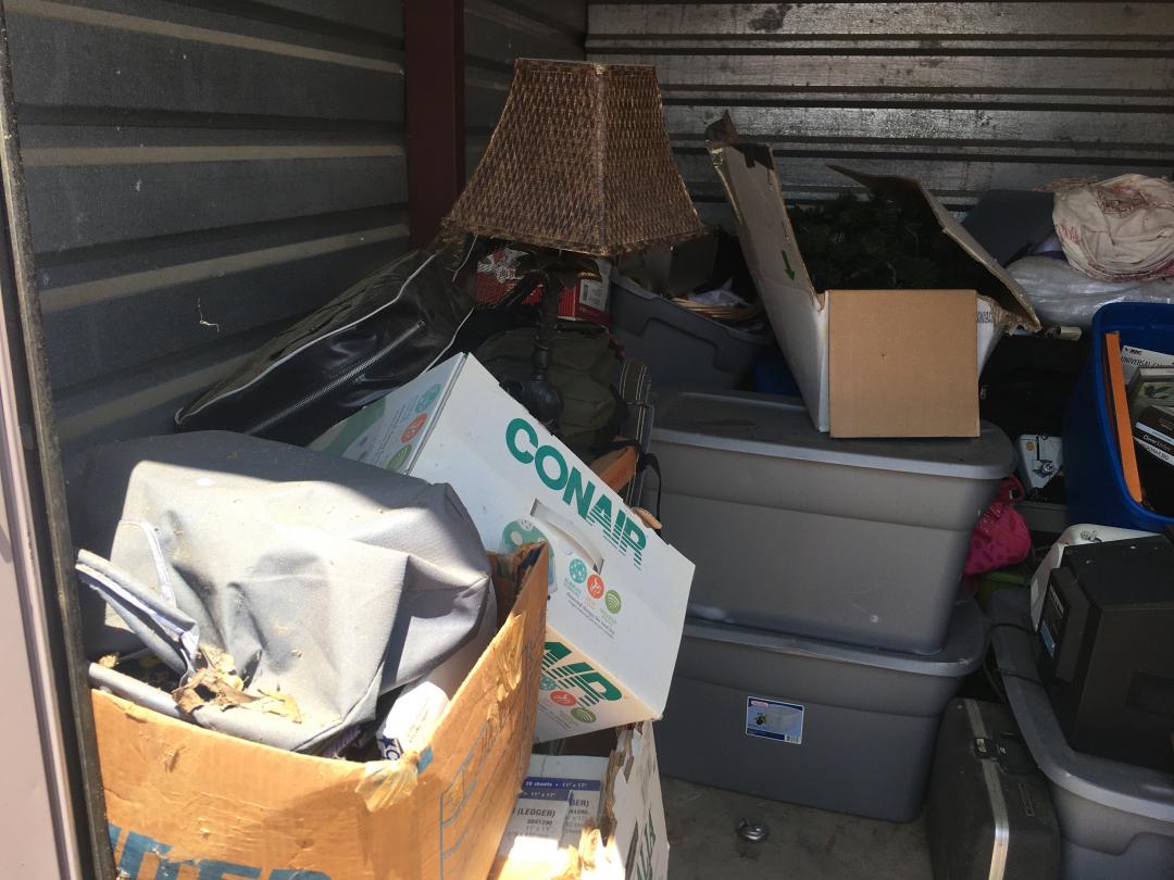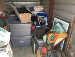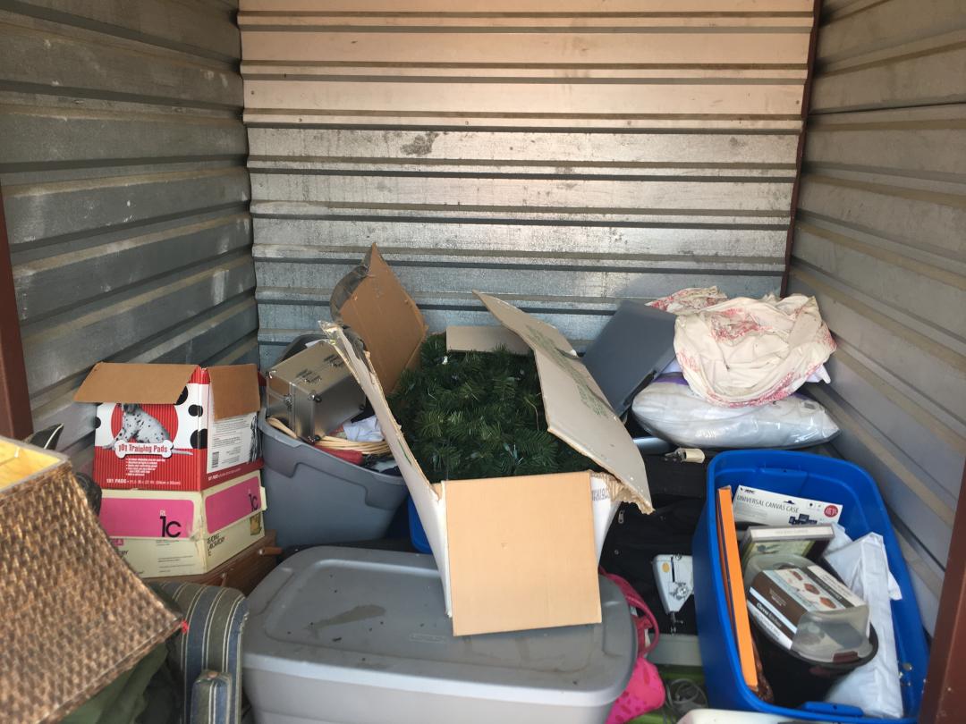 This unit appears to contain…TV, Framed Artwork, Briefcase, Lamp, Tennis Racket, Guitar Hero Controller, Christmas Tree Stand, Prelit Christmas Tree, 2 Chairs, Book Bag, Small Metal Box, Sewing Machine, Mirror, Luggage, Misc Totes, Misc Boxes, Pots and Pans.