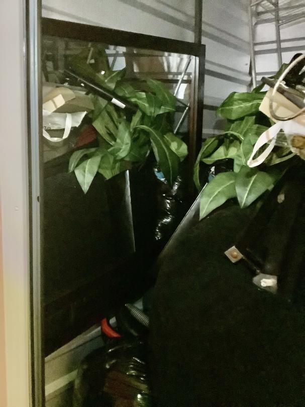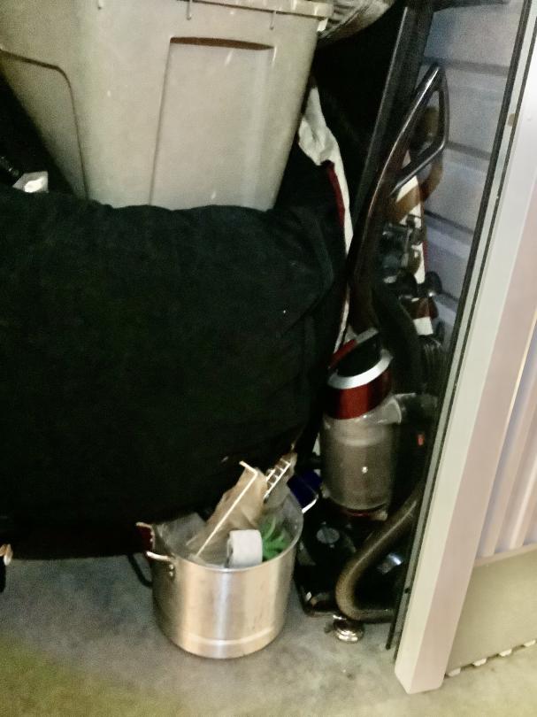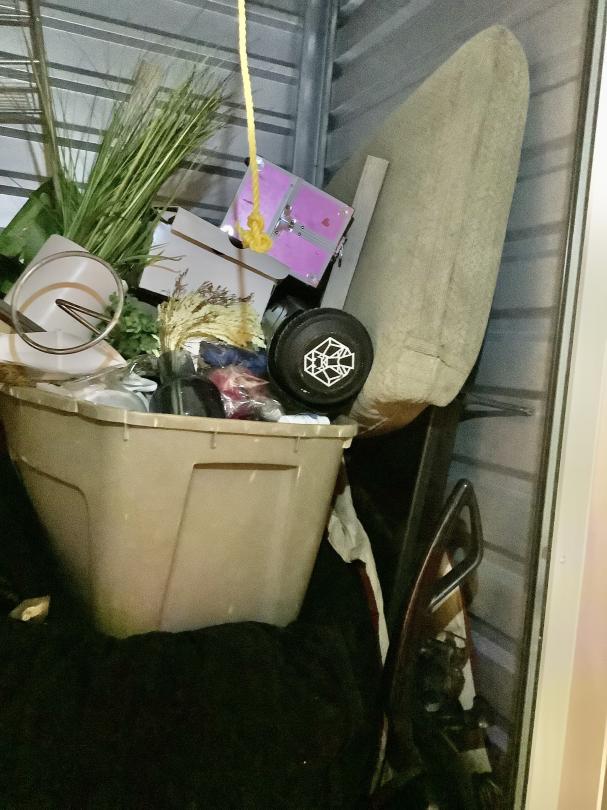 This unit appears to contain…Plastic totes, black bag, exercise equipment, boxes, fishing pole, golf club, punching bag, basket