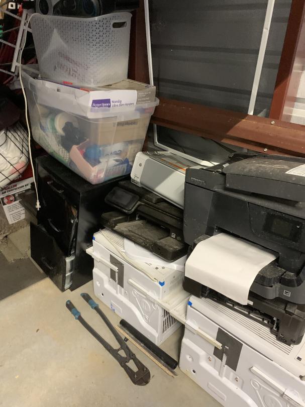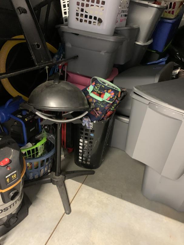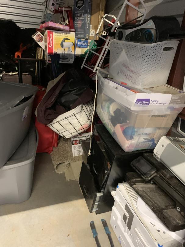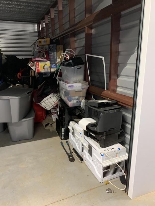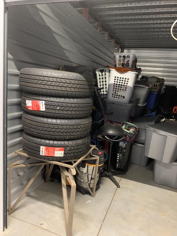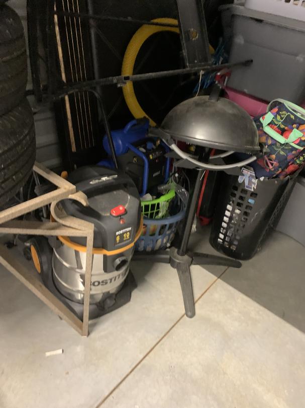 This unit appears to contain…Shop Vacum; Air Compressor; Standing Grill; Vacuum; Tables; 16' Tires; plastic totes; weed eater;