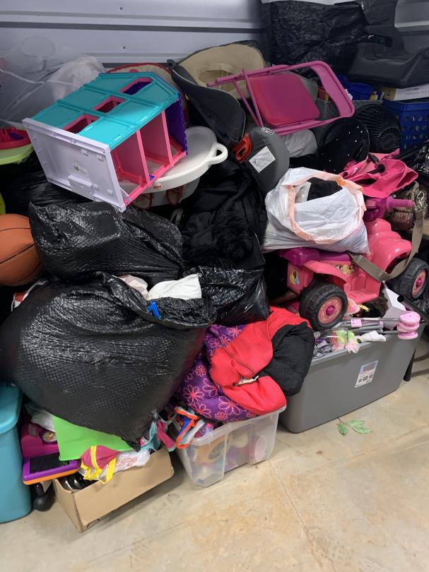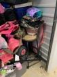 This unit appears to contain…Toddler 4-wheeler; Tricycle; kidschair; kids toys; crib mattress; high chair; clothing; luggage; car set; stroller; misc items; stools; plastic totes