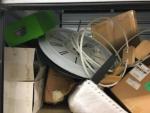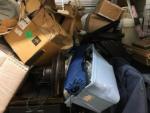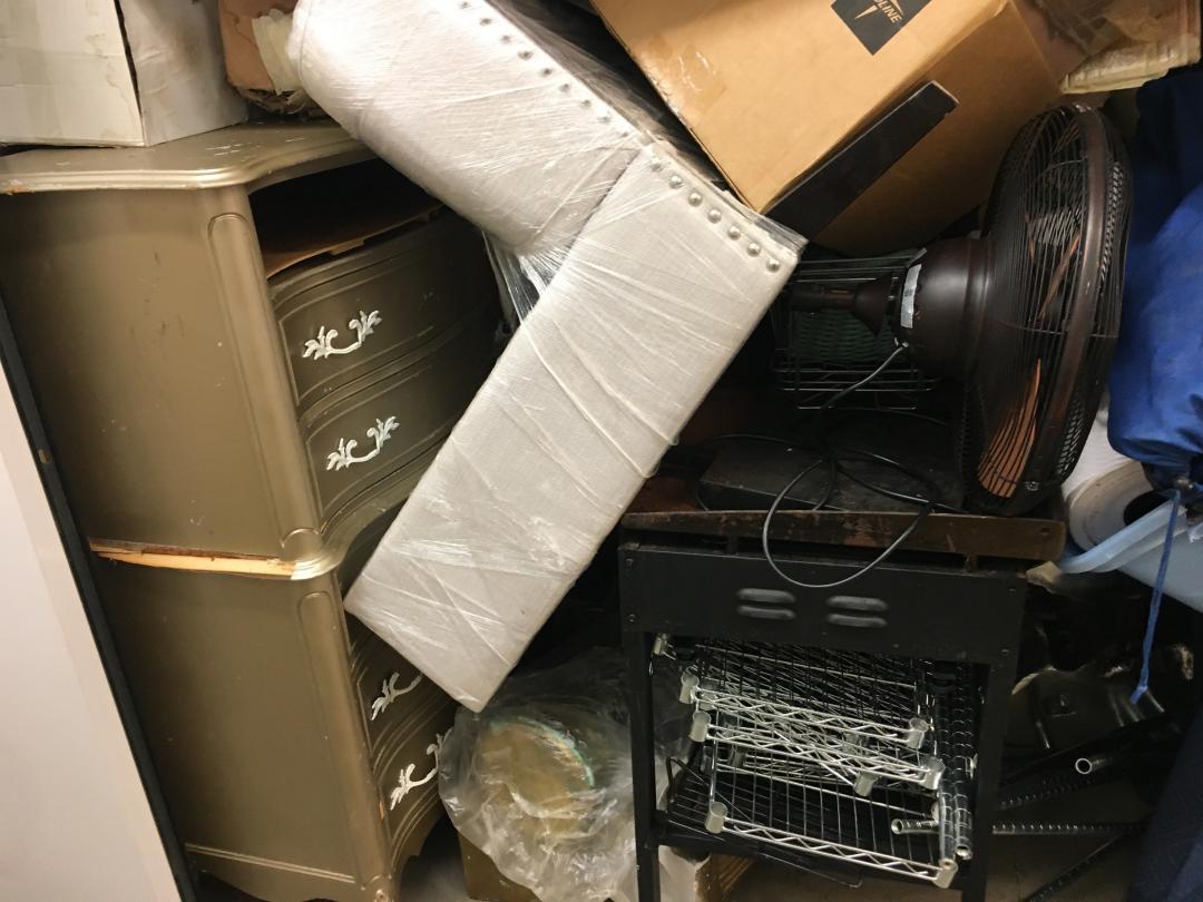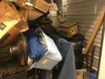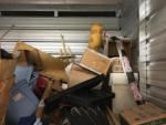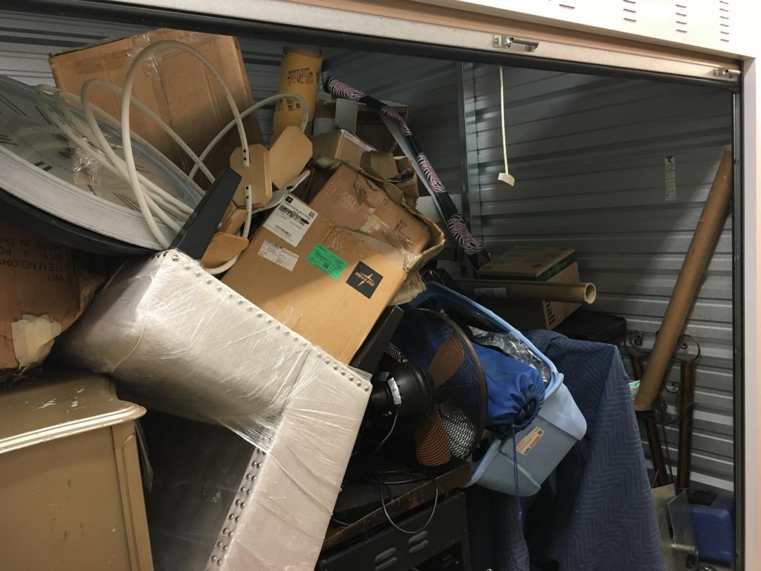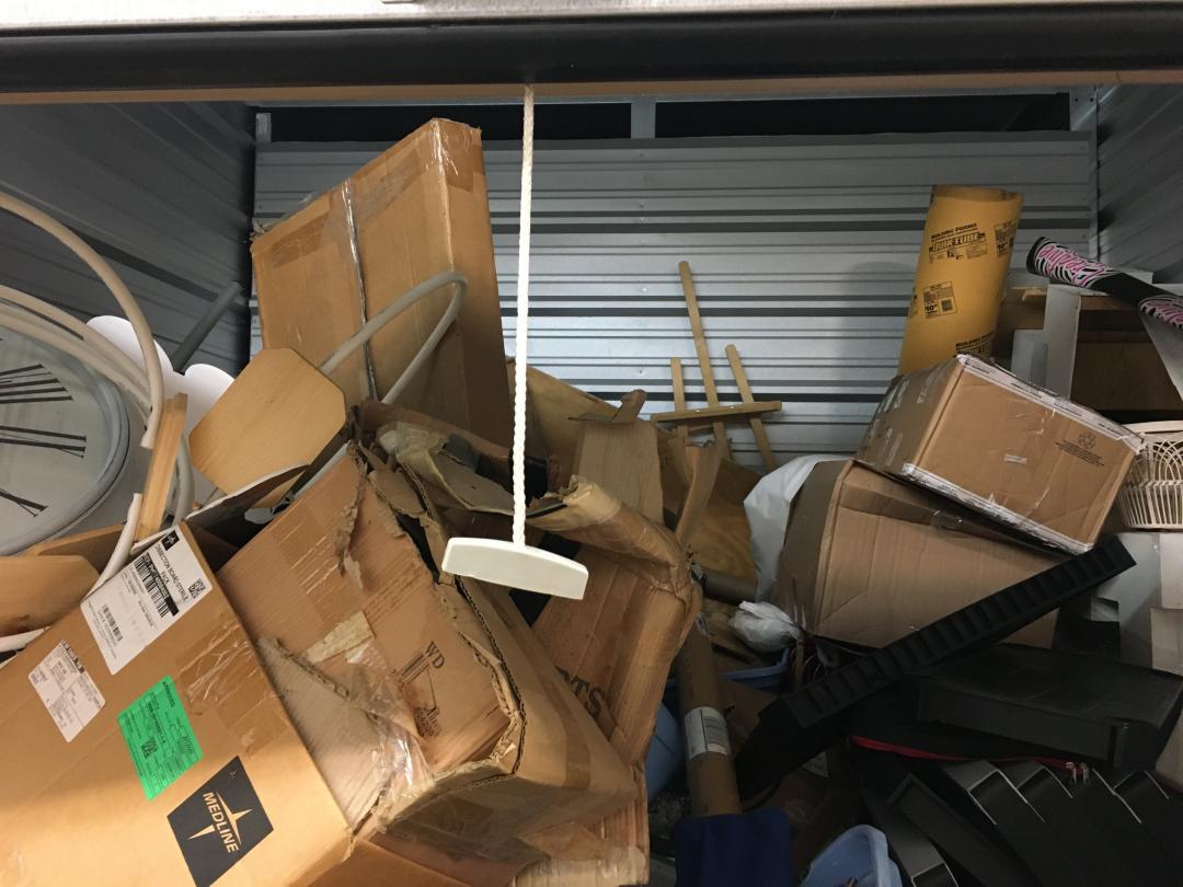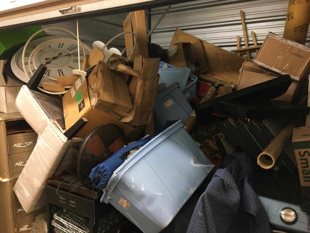 This unit appears to contain…Washer/Dryer, Misc Boxes, Misc Totes, Plastic Shelving, Portable Safe, Chest of Drawers, Chair, Fan, Metal and Plastic Shelving, Patio Decorations, 2 Disco Balls, Large Wall Clock, Lare Wooden Easel, Misc Bags, Wooden Desk, Folding Chairs.