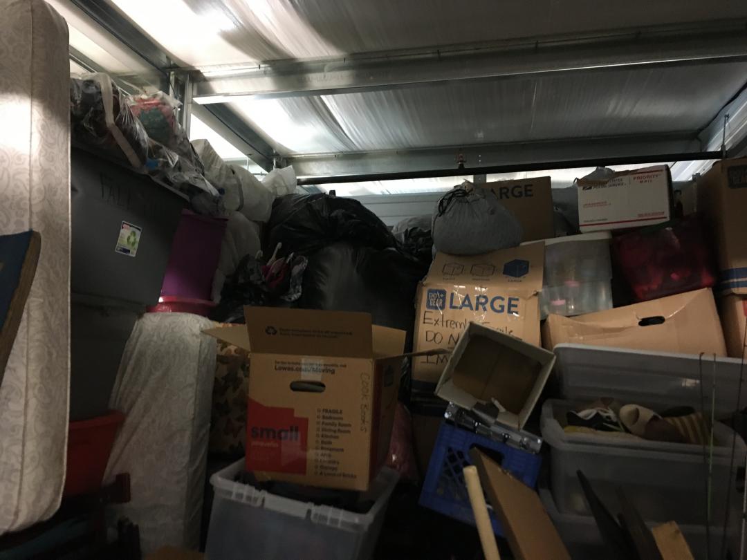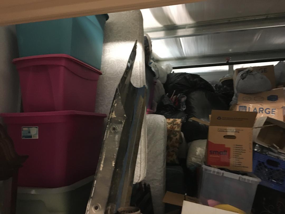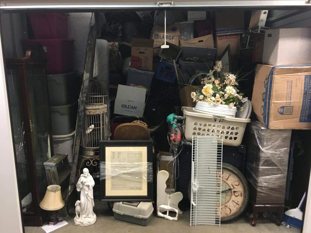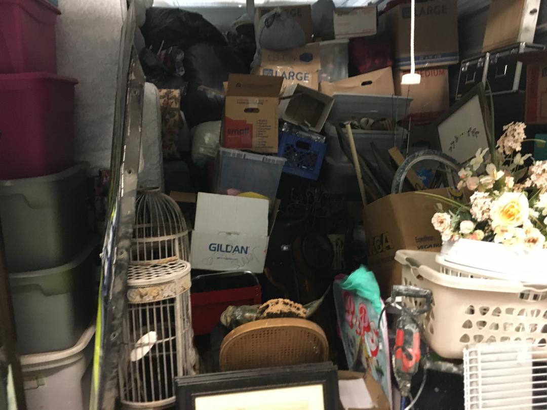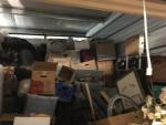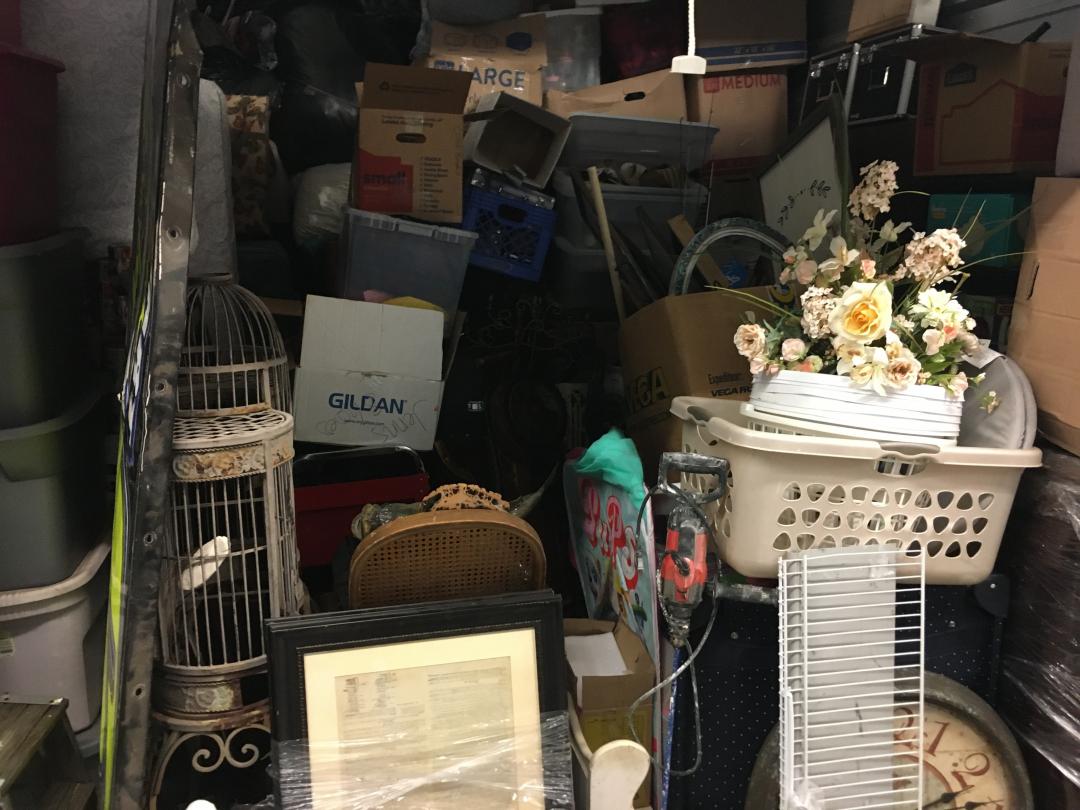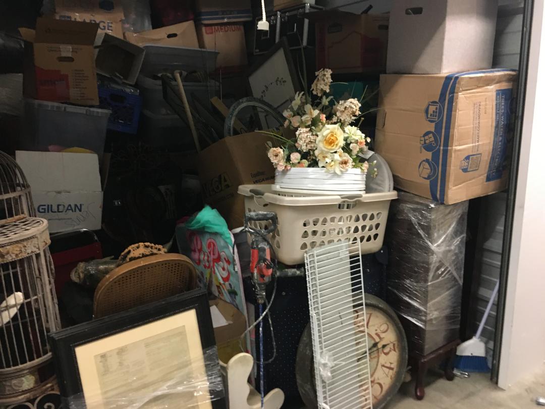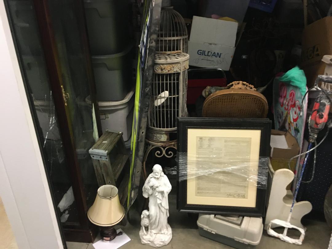 This unit appears to contain…Small Cabinet, Misc Boxes, Misc Bags, Wooden Shelf, Table, Large Wall Clock, Pack and Play, Laundry Baskets, Mounted Fish, Child's Bench, Electric Paint Stirrer, Tackle Box, Display Cabinet, Bird Cage, Step Ladder, Lamp, Rocking Chair, Framed Art, Mini Statue, Camera Bag, 2 Mattresses and Baby Bed, Rolling Tool Cart, Luggage, Guitar Case, Misc Totes, Baby Bed, Fishing Poles.