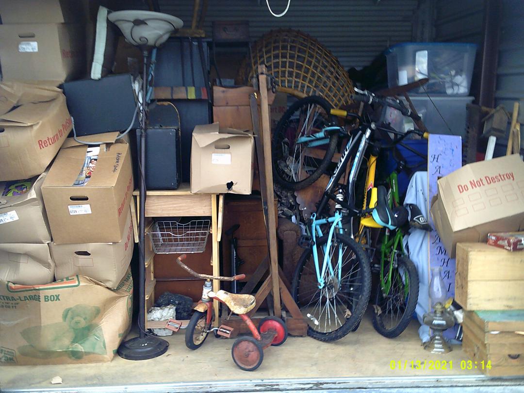 This unit appears to contain…READ ALL AUCTION RULES BEFORE BIDDING!!! Unit appears to contain: Hess trucks, boxes, totes, bikes, tv, chair, lamps, microwave, skateboard, dresser, desk, kitchen tools, RC cars, end tables, recliner