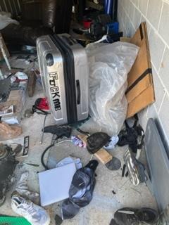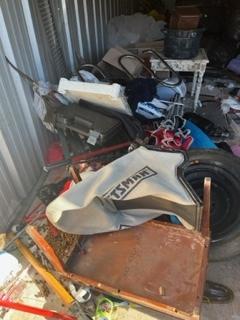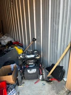 This unit appears to contain…TOOLBOX, TIRES, BIKES, COMPUTER EQUIP, LAMPS, RECLINER, TABLE, PATIO FURNITURE, MISC BAGS, TOTES & BOXES, CLOTHING/SHOES, SPORTS GEAR, SUTICASES, CDS/DVDS, ELECTRIC GRILL, WICKER BASKET, SMITH & WESSON GUN CASE, BOLT CUTTERS, CAMPING CHAIRS, LAWN MOWER, SHOVEL, HOUSEHOLD ITEMS NIGHTSTAND,