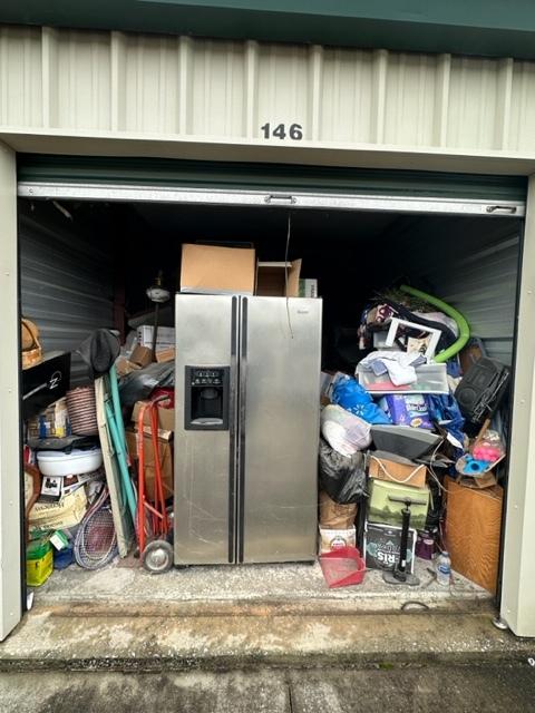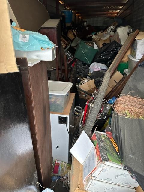 This unit appears to contain…Refrigerator, Sporting Equipment, Mountain Bike, Shelving, Patio Furniture, Table, Stools, Full Household