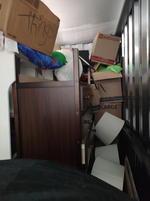 This unit appears to contain…This unit appears to contain bed frames, Dressers, lamps, plastic bags, Miscellaneous boxes, toys